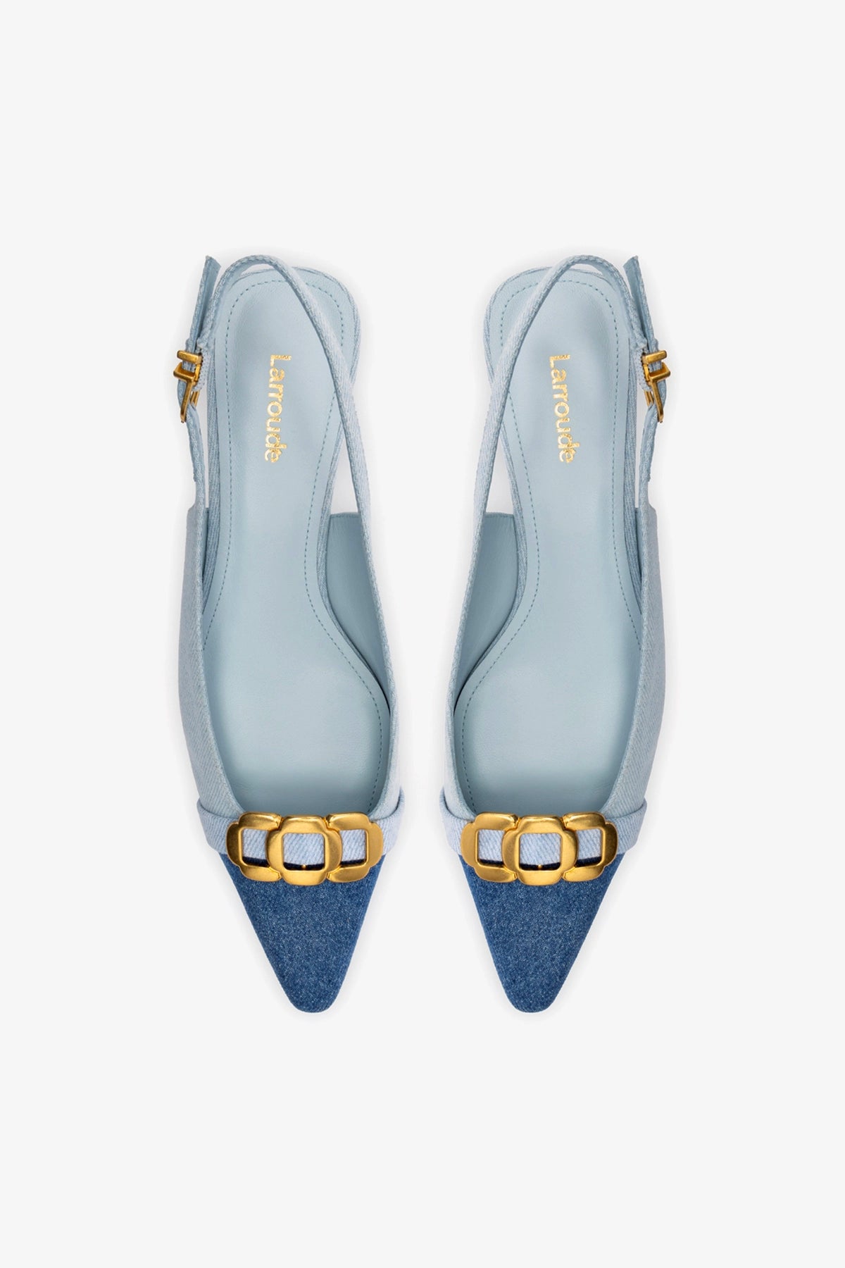 Unindo a elegância atemporal de um salto gatinho e bico fino com a casualidade do jeans, o slingback Franca é uma fusão inusitada e super cool. A fivela dourada no peito do pé arremata o visual com um toque chic, transformando o básico em uma peça cheia de personalidade.