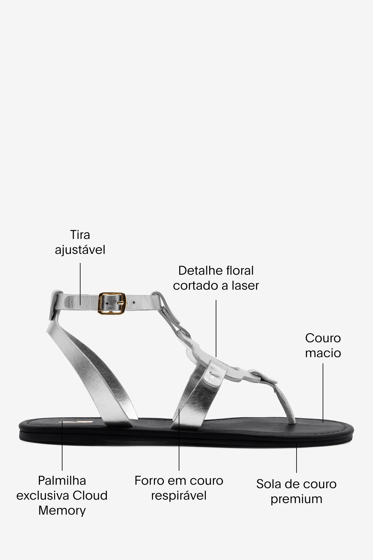 Margherita traz uma leitura moderna para a sandália flat, unindo o charme do detalhe vazado em margarida ao visual clean das tiras múltiplas. As tiras em couro abraçam o pé com conforto, enquanto a fivela ajustável garante firmeza do começo ao fim do dia.
