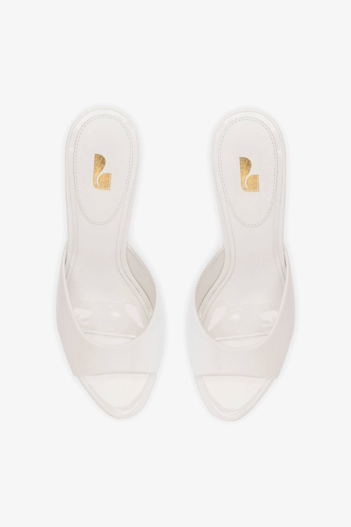 Com uma vibe retrô, a mule Jasmine Hi em couro verniz branco é um dos modelos mais versáteis da temporada, com forro em couro macio, salto altíssimo surpreendentemente confortável e um elegante bico aberto que alonga a silhueta.