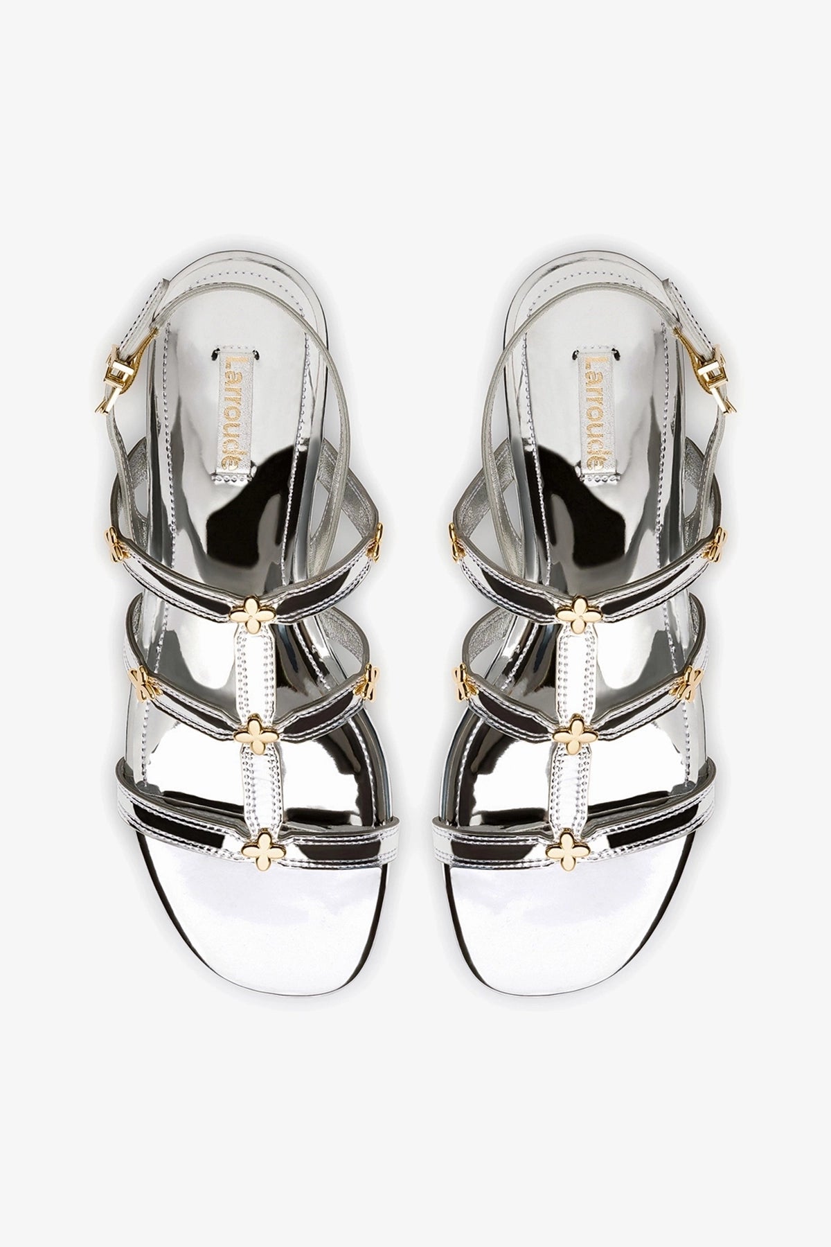A sandália Harmony é um clássico instantâneo. Em couro prateado, ela une a elegância de suas tiras finas e sua silhueta rasteira à delicadeza de pequenas flores douradas, que criam uma harmonia perfeita.