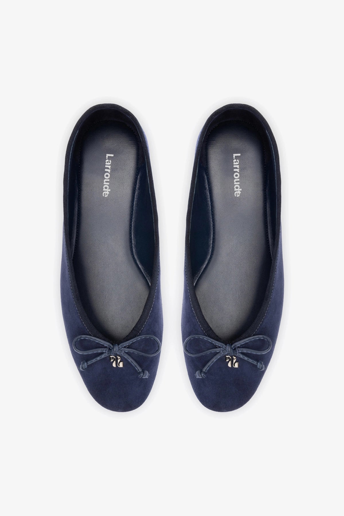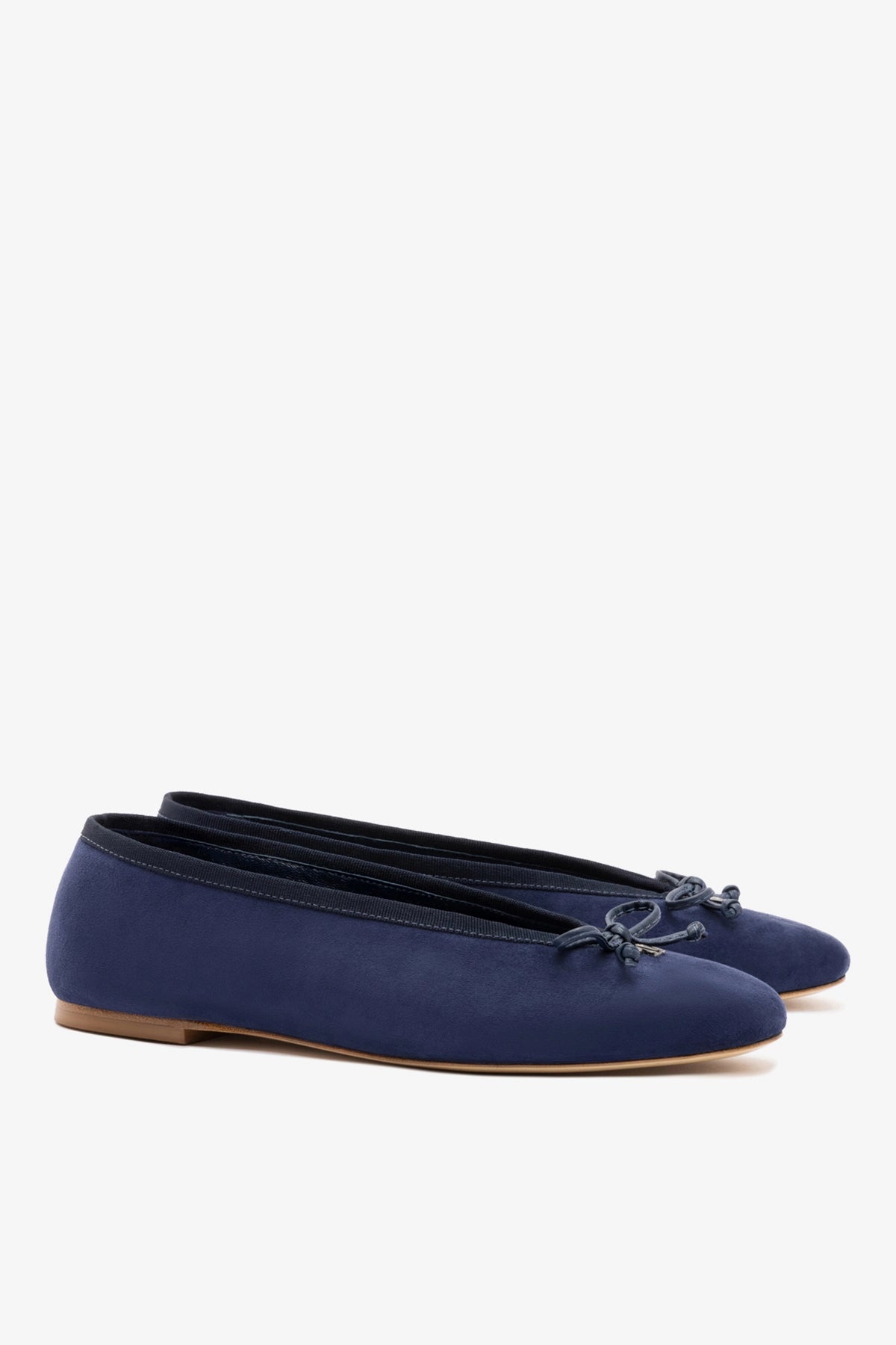 Um ícone do nosso closet, a sapatilha Pavlova foi reimaginada em camurça azul-marinho – um neutro inesperado que vai bem com tudo. Com seu bico arredondado elegante e um delicado laço amarrado à mão, esse é o tipo de par atemporal que eleva qualquer look.