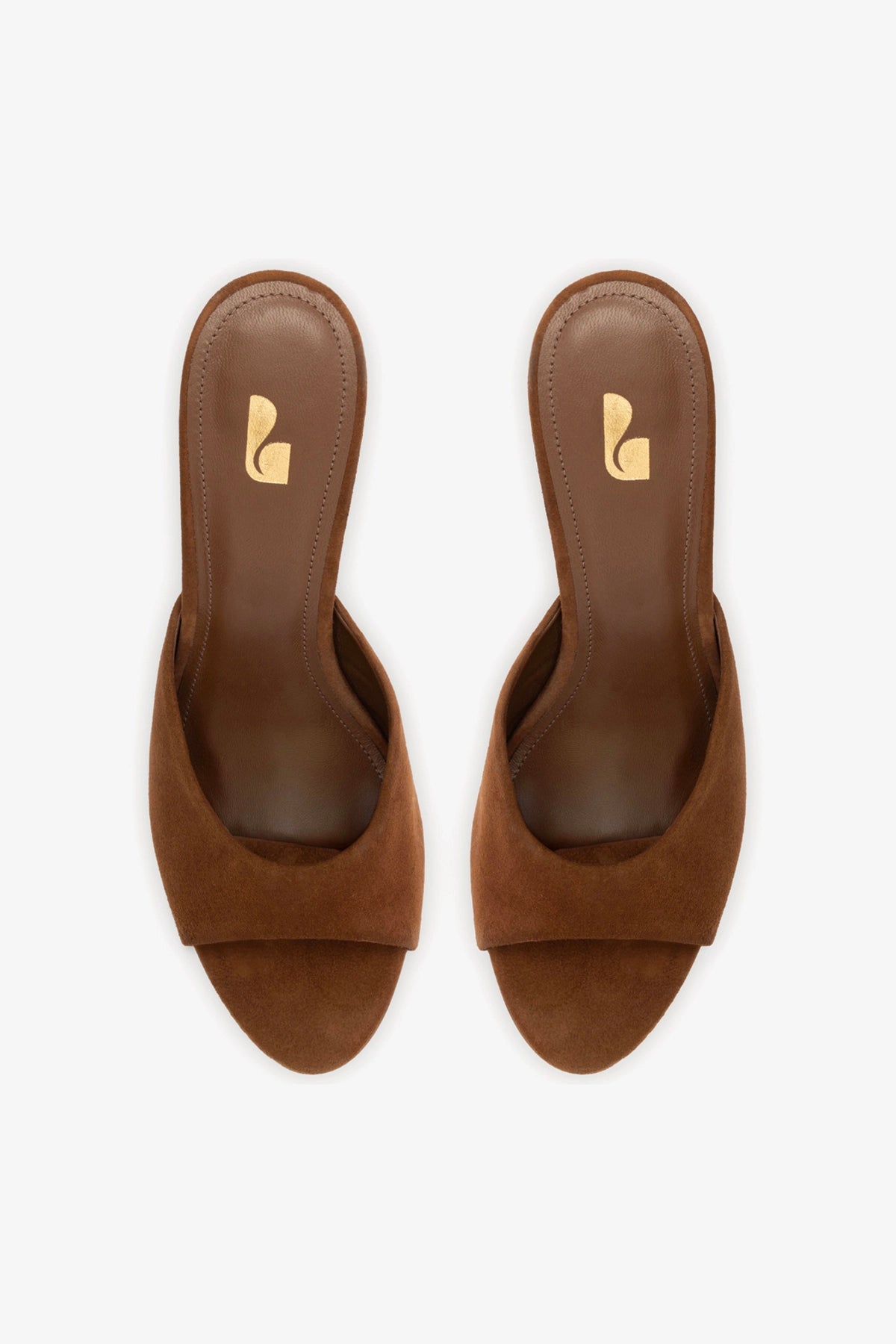 Com uma vibe retrô, a mule Jasmine Hi em camurça marrom é um dos modelos mais versáteis da temporada, com forro em couro macio, salto altíssimo surpreendentemente confortável e um elegante bico aberto que alonga a silhueta.