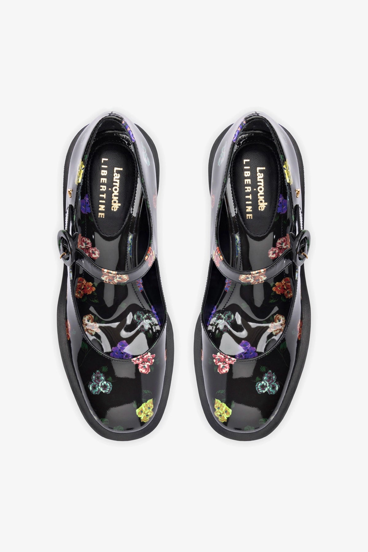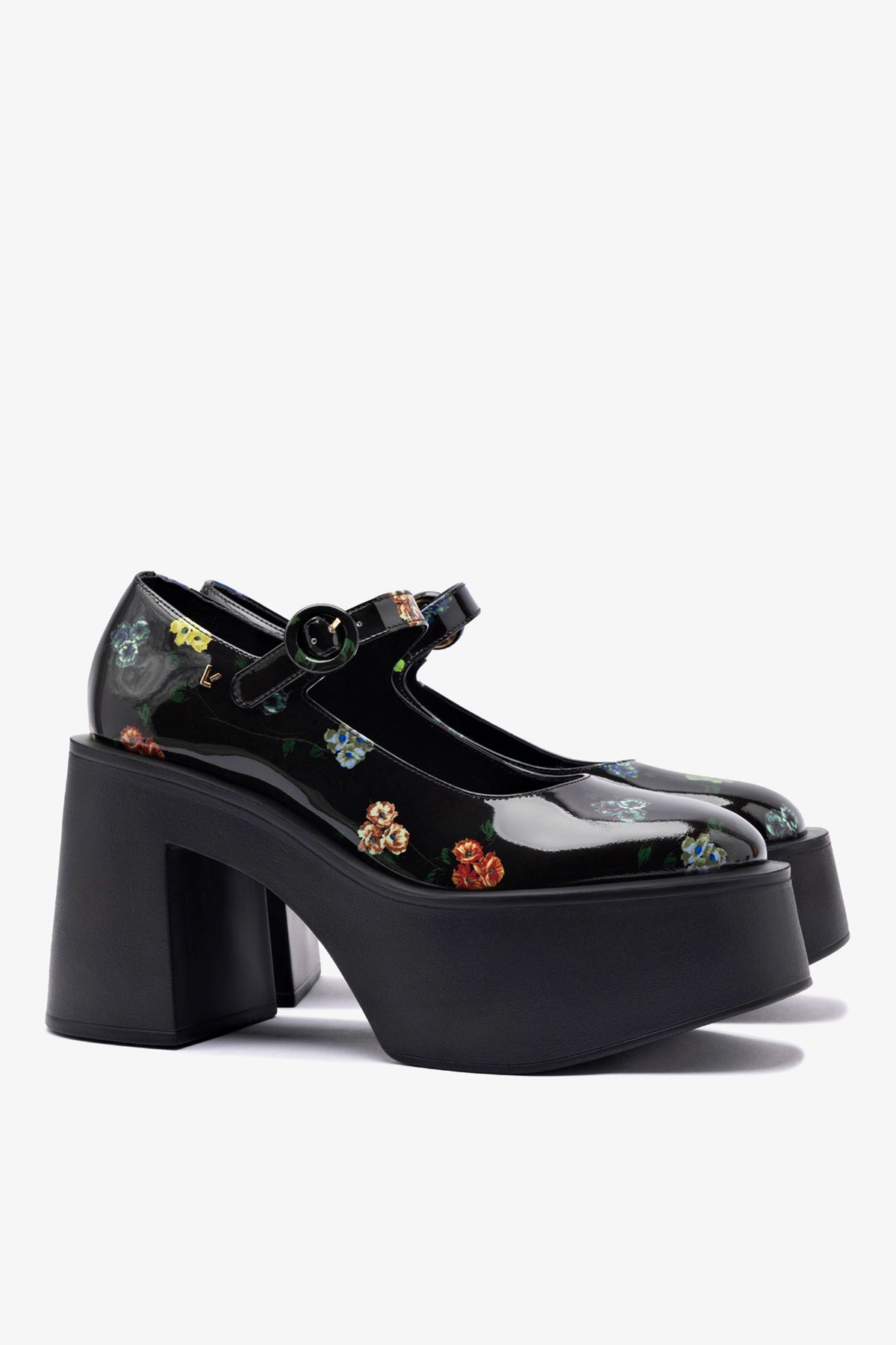 O toque divertido da Larroudé encontra a ousadia criativa da Libertine neste modelo mary-jane com plataforma super robusta. O visual colegial repaginado com uma pitada de punk e o charme irreverente da estampa floral são a cara da marca californiana.
