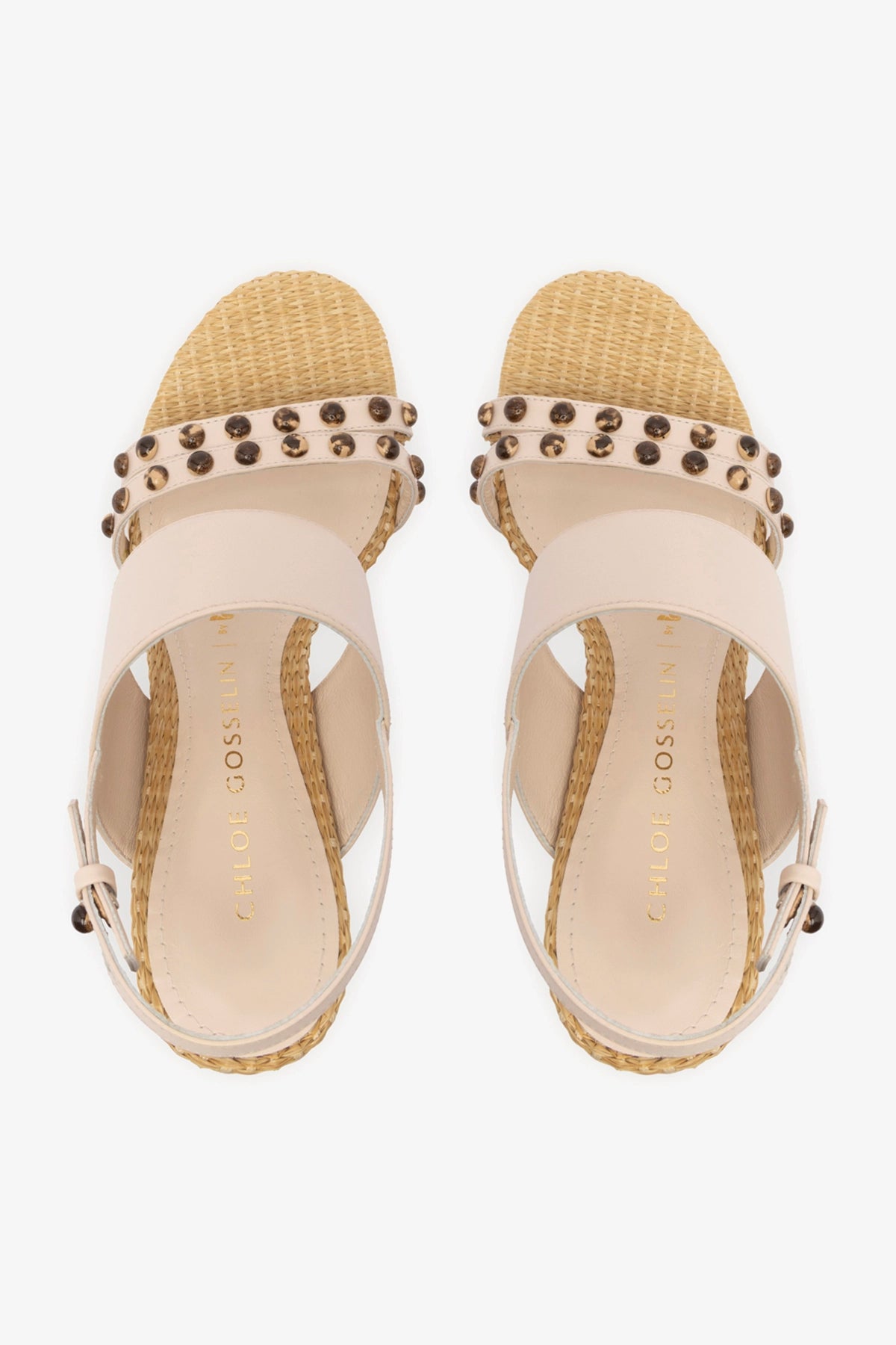 Essa sandália da parceria Chloe Gosselin by Studio Larroudé se inspira na estética singular da sua designer. Decorada por metais chamativos e um adorno de pedrarias – combinados a tiras de couro e um salto em ráfia robusta –, esse modelo chic funciona para o dia e para a noite!