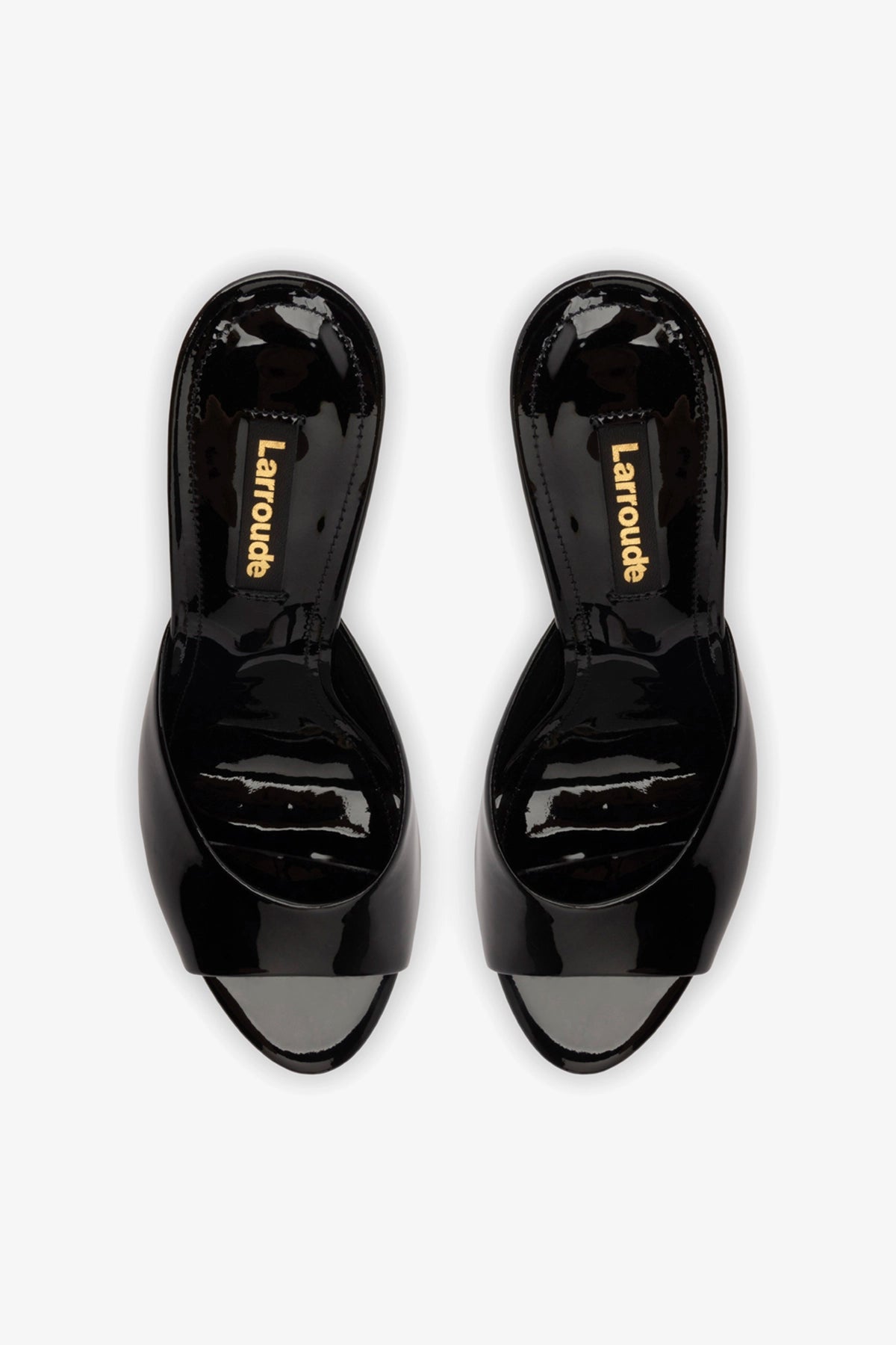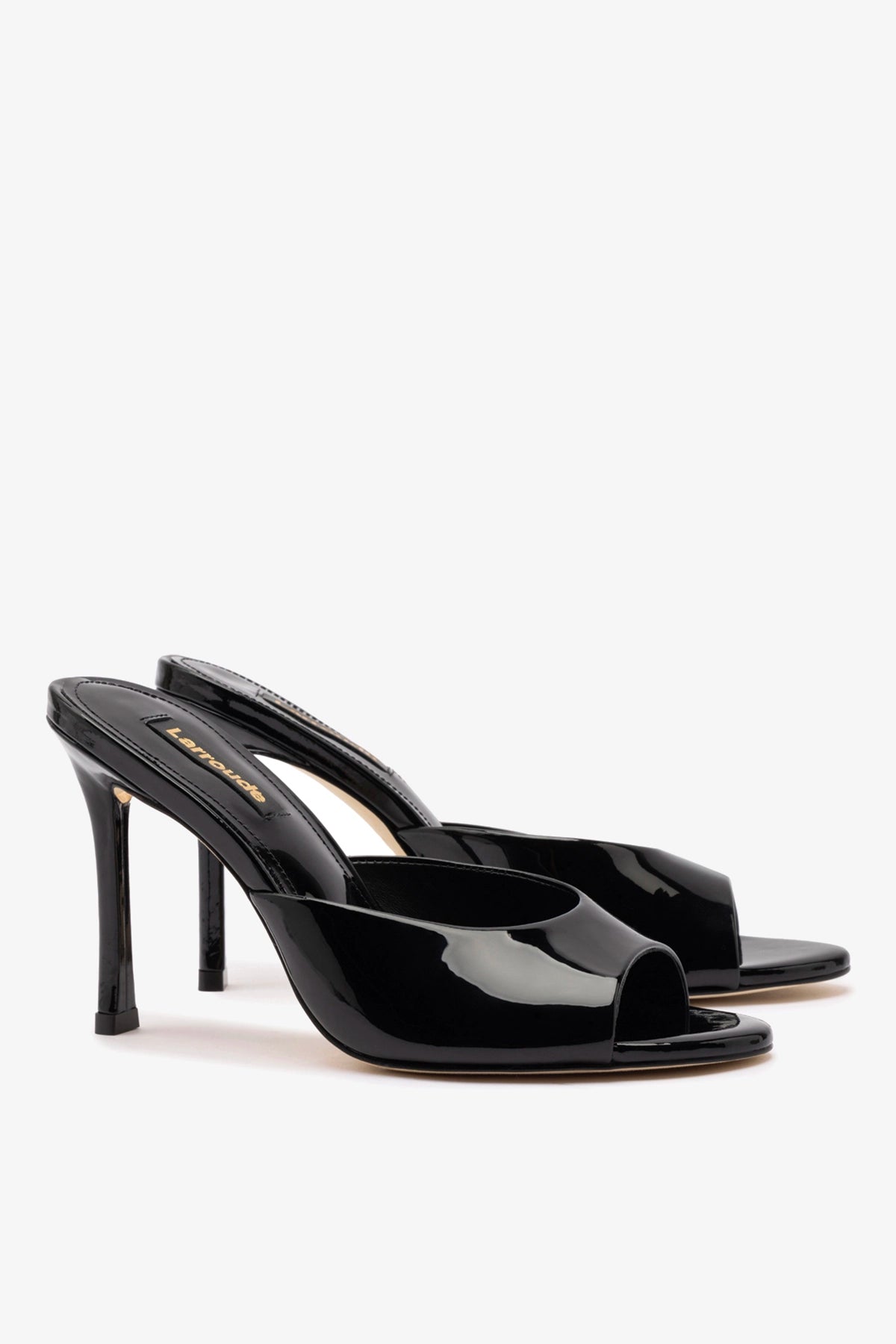 Com uma vibe retrô, a mule Jasmine Hi em couro verniz preto é um dos modelos mais versáteis da temporada, com forro em couro macio, salto altíssimo surpreendentemente confortável e um elegante bico aberto que alonga a silhueta.