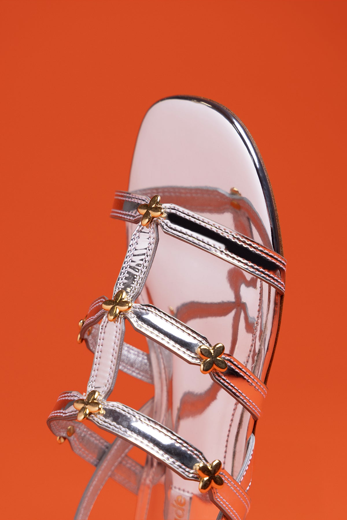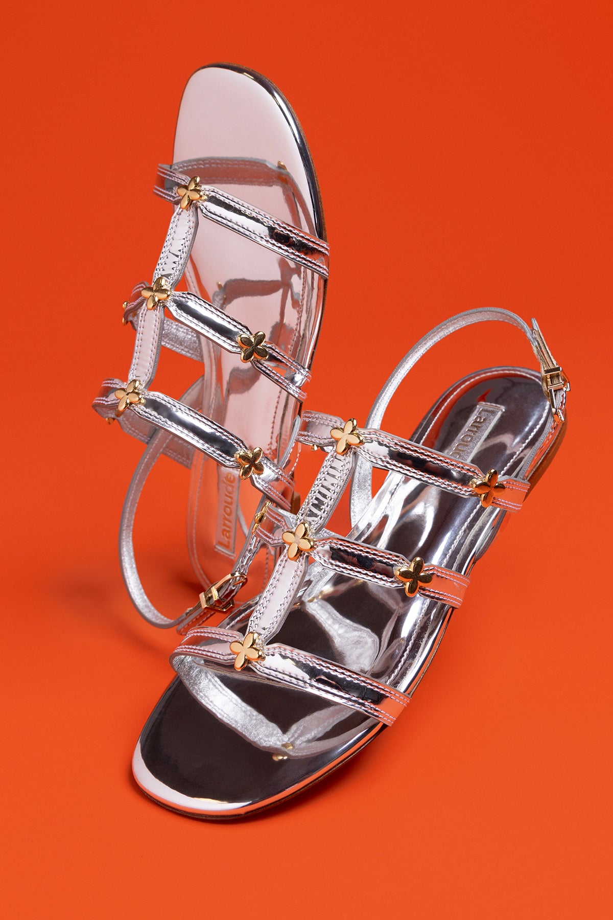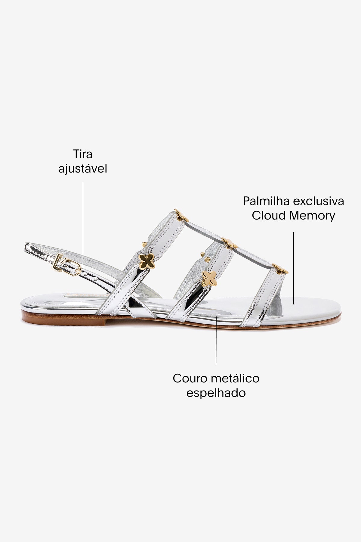 A sandália Harmony é um clássico instantâneo. Em couro prateado, ela une a elegância de suas tiras finas e sua silhueta rasteira à delicadeza de pequenas flores douradas, que criam uma harmonia perfeita.
