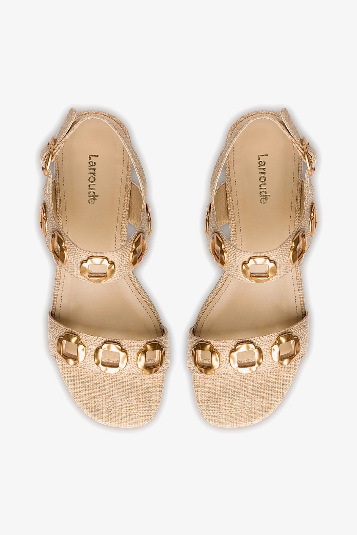 Detalhes metálicos são uma paixão Larroudé, e a sandália flat Milan não é exceção! O glamour luxuoso fica por conta dos metais dourados, contrastando com o ar natural da ráfia. O solado flat garante conforto sem perder a elegância para o dia e para a noite.