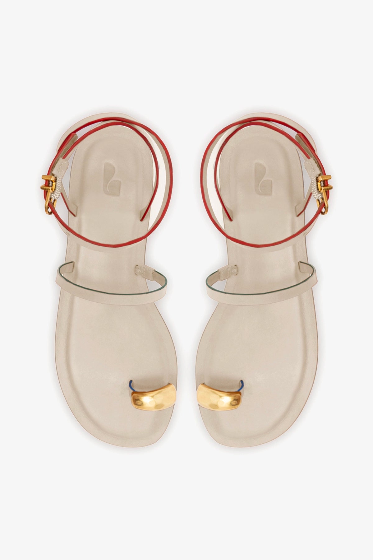 A mais nova sandália flat da Larroudé, Biarritz homenageia a charmosa costa francesa em uma silhueta que traz metais dourados ousados e tiras em off white que envolvem o tornozelo, em um efeito alongado e chamativo.