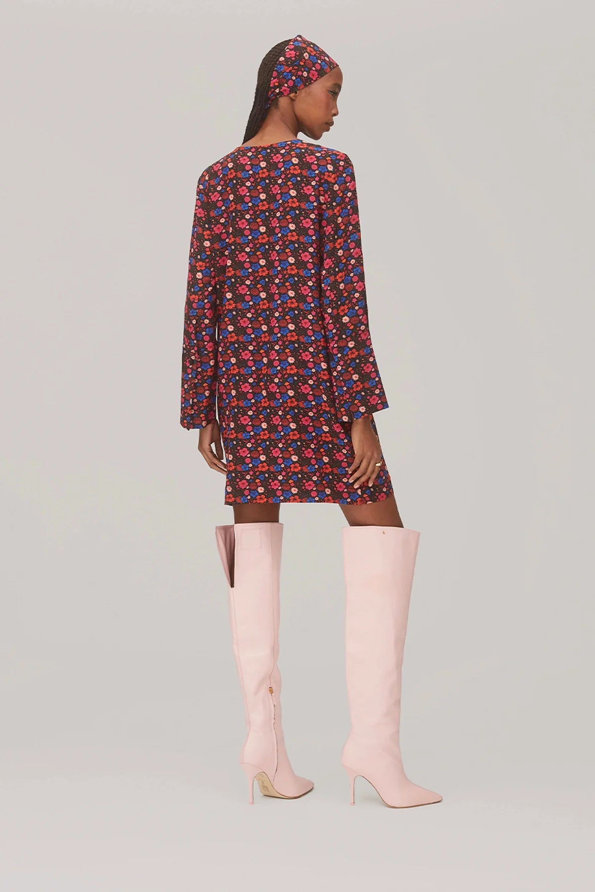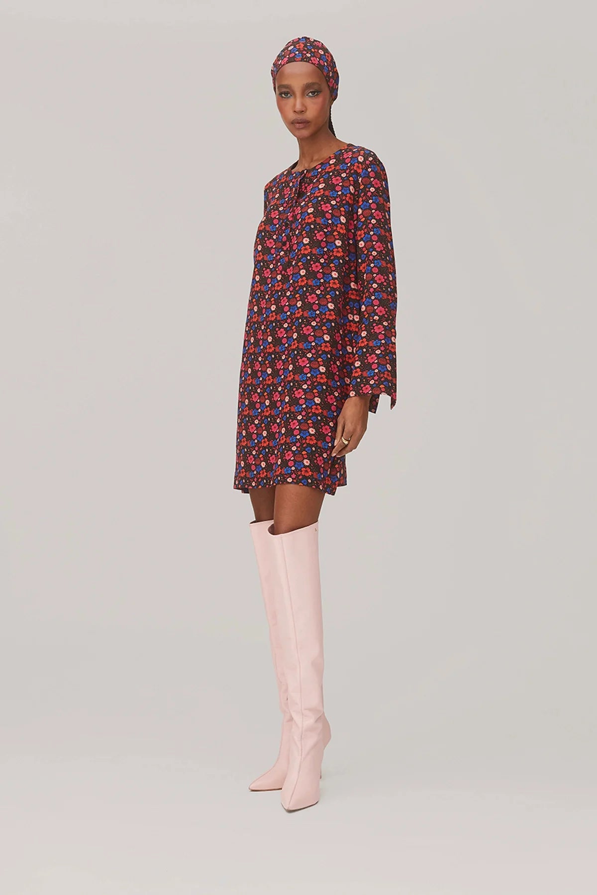 Vestido curto estilo túnica em seda floral preta, com caimento leve e shape solto que prioriza conforto e movimento. A modelagem simples valoriza a estampa, criando uma peça fácil de usar e versátil para diferentes momentos do dia.