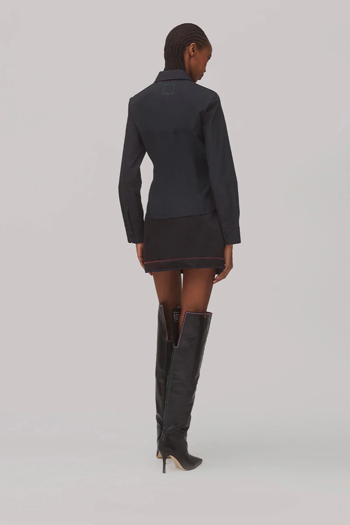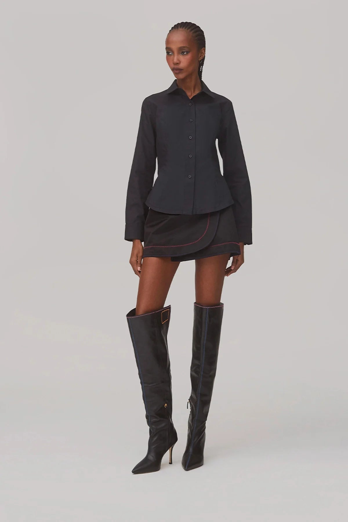 Camisa bustiê em percal preto, com modelagem estruturada e acabamento limpo. O design minimalista valoriza a silhueta de forma equilibrada, criando uma peça versátil e fácil de combinar.