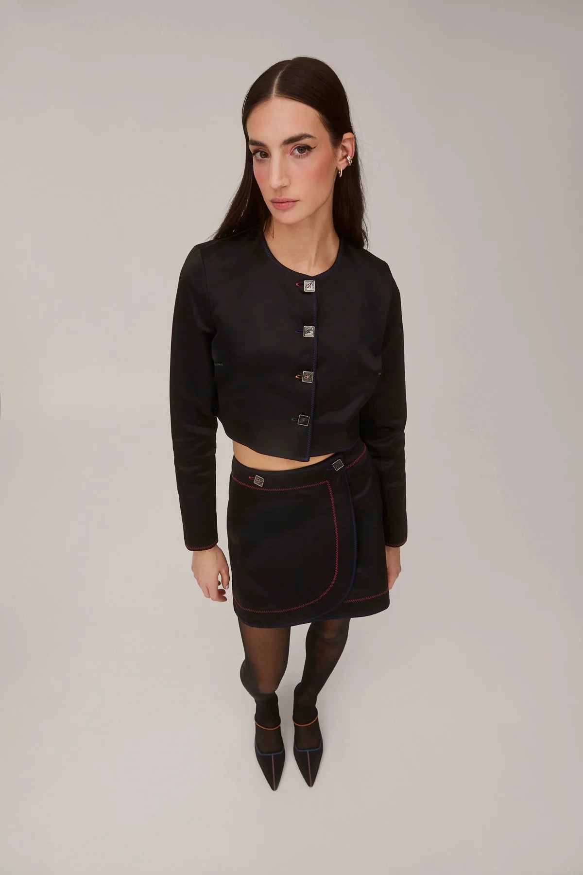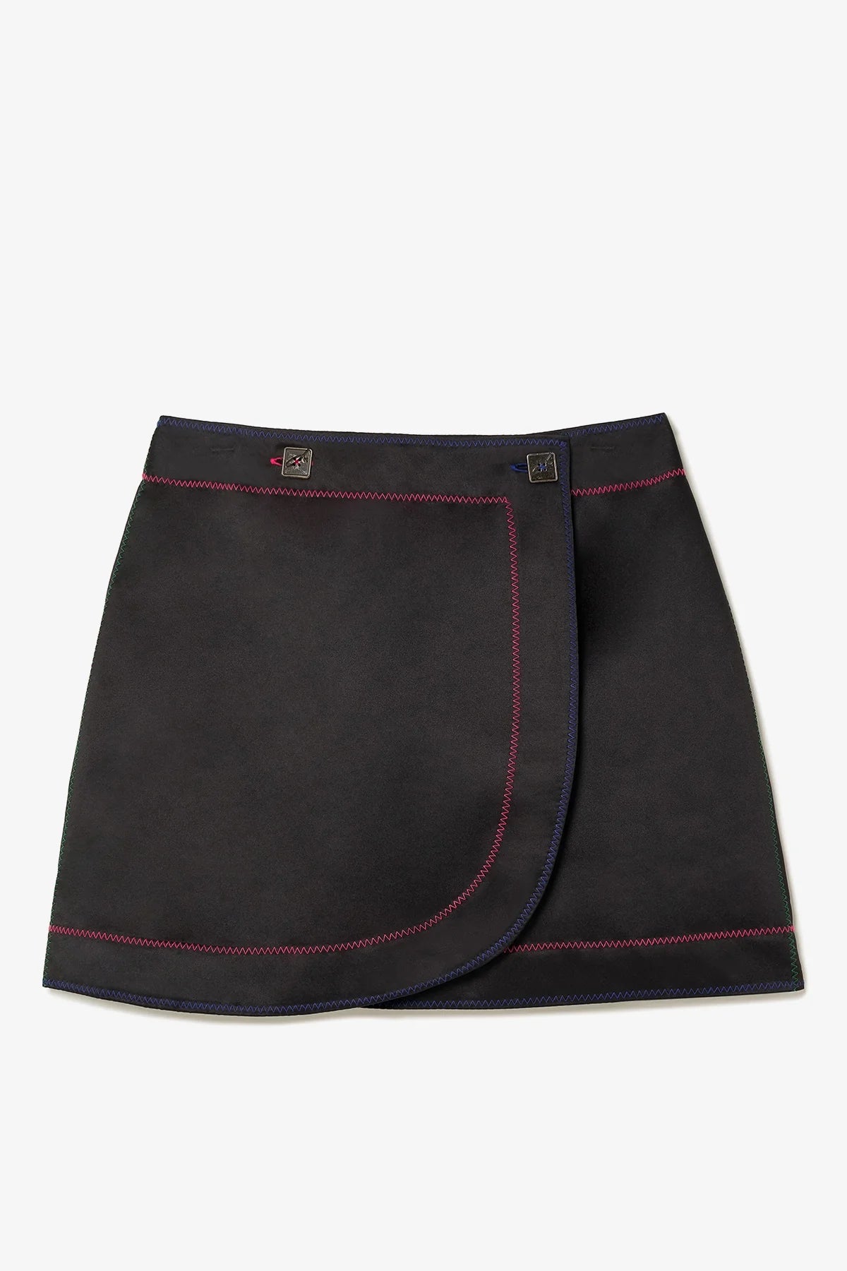 Saia curta em cetim preto, com caimento leve e design clean. A modelagem mini valoriza a silhueta de forma equilibrada, criando uma peça fácil de combinar e ideal para o uso diário.