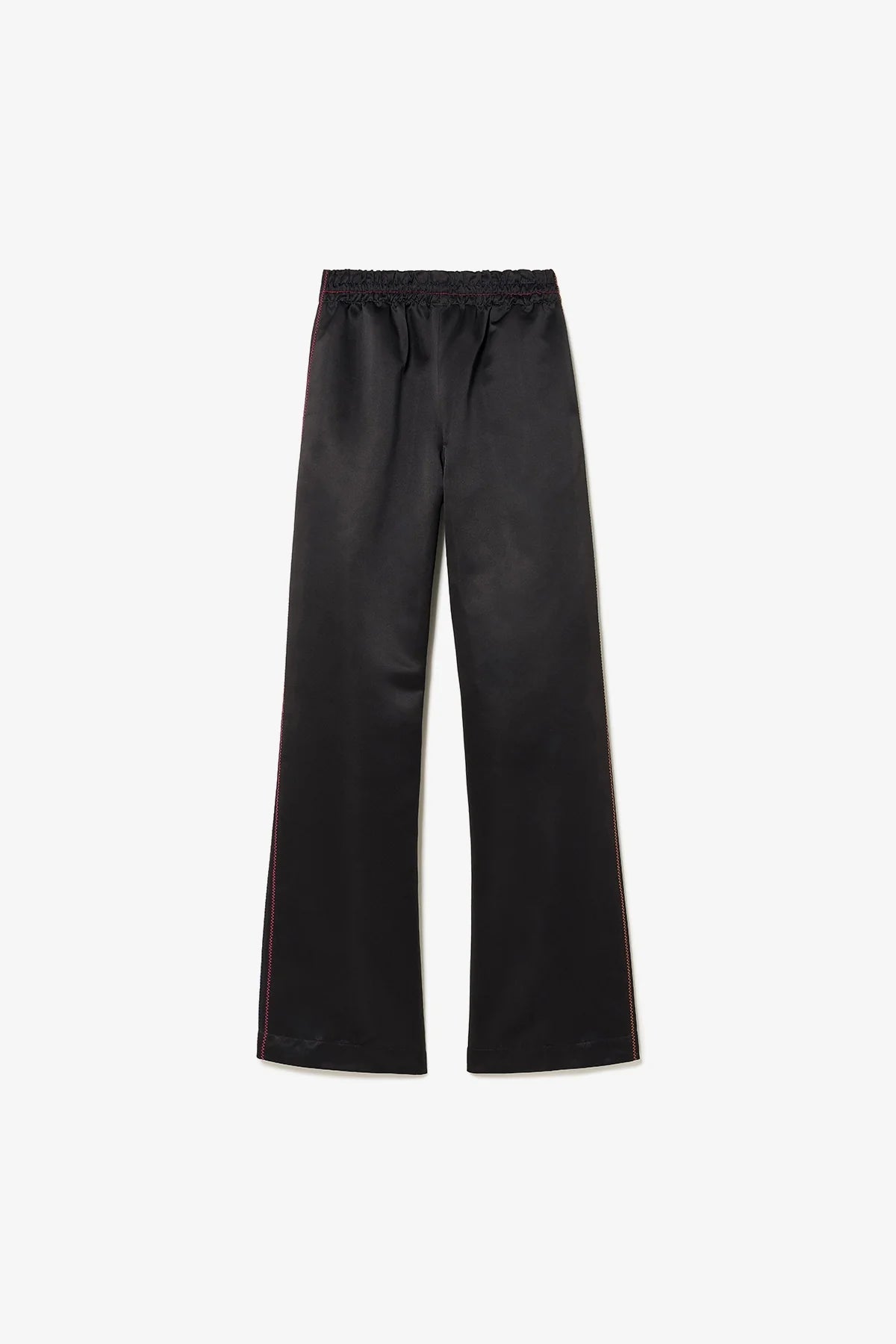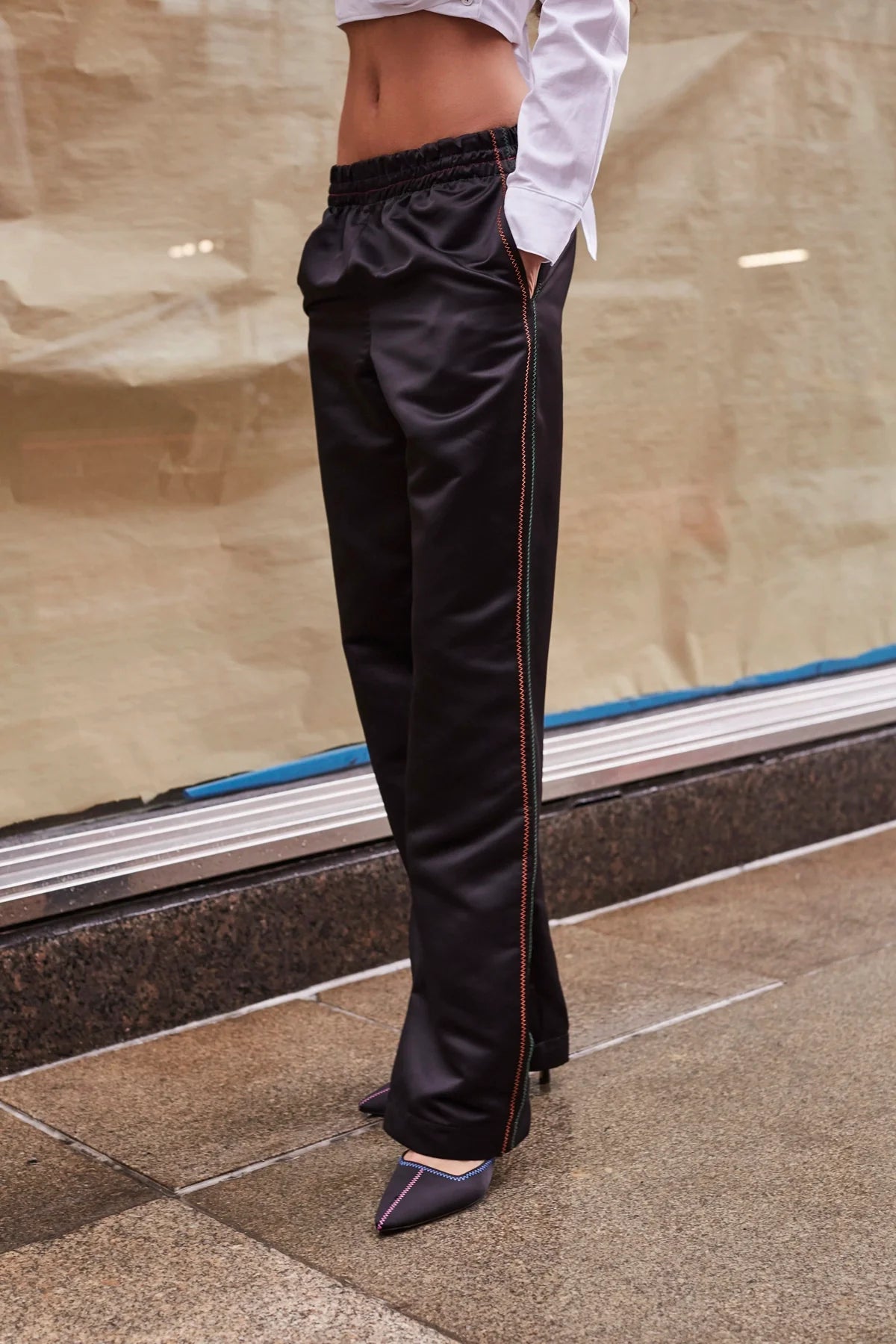 Calça jogger em cetim preto, com caimento leve e toque acetinado. A modelagem confortável traz uma leitura atual e versátil, equilibrando acabamento refinado e uso prático no dia a dia.