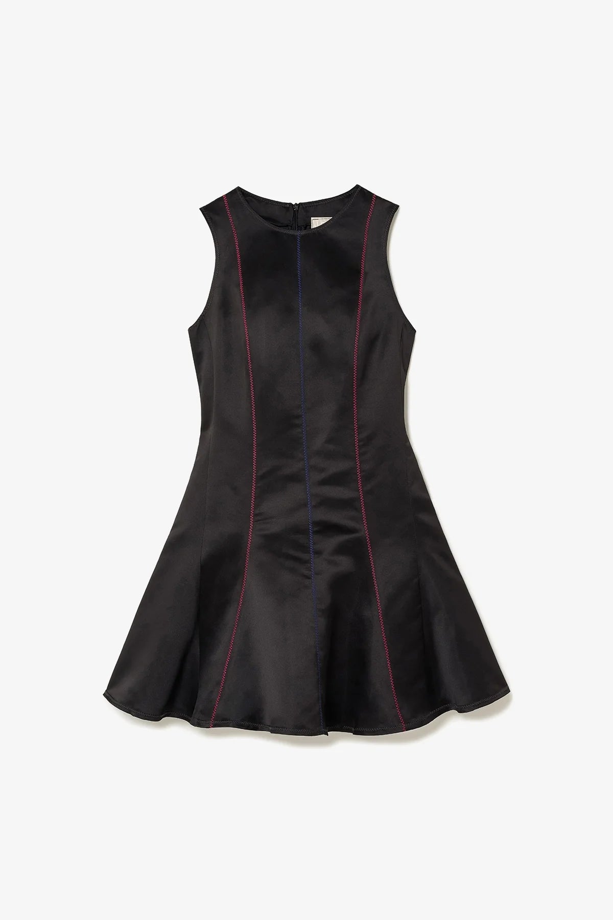 Vestido curto em cetim preto, com modelagem sem mangas e caimento fluido que acompanha o movimento do corpo. As costuras aparentes em tom contrastante criam linhas verticais que alongam a silhueta, trazendo um visual limpo e atual.