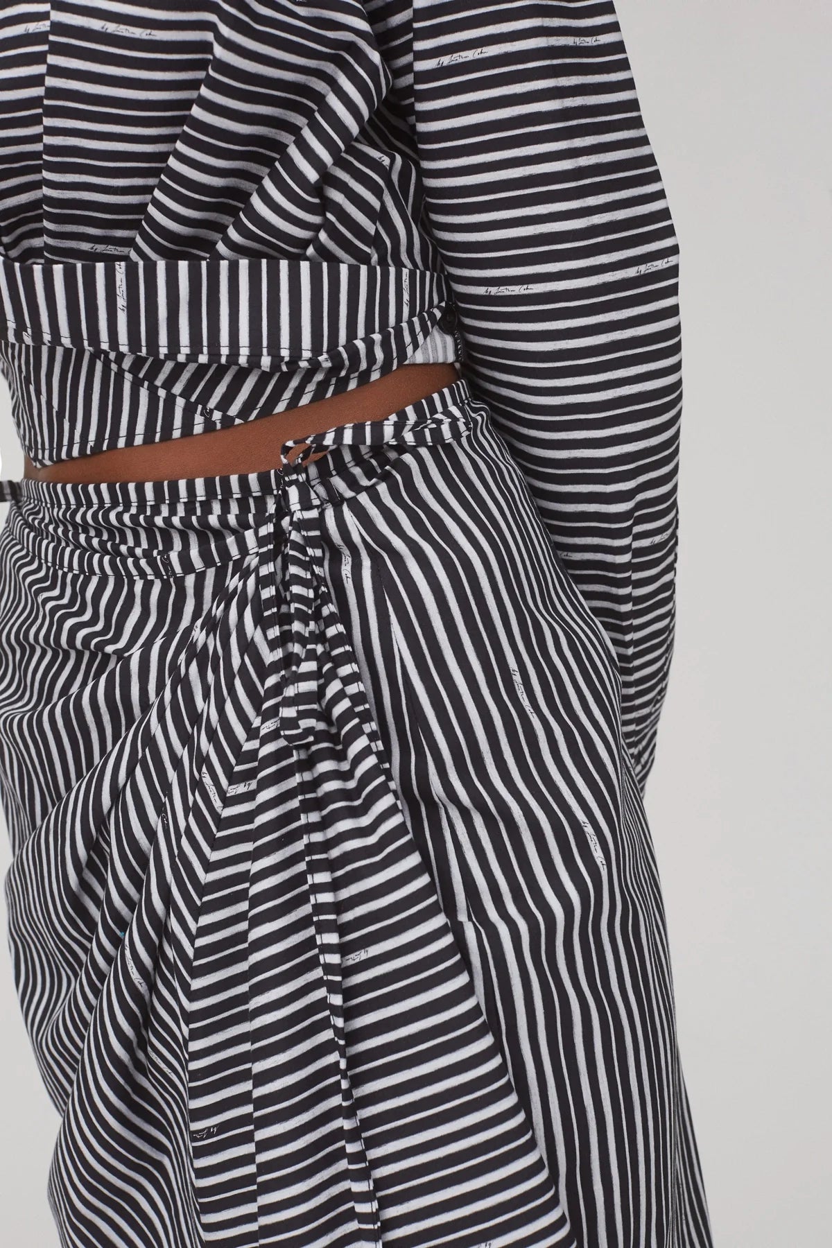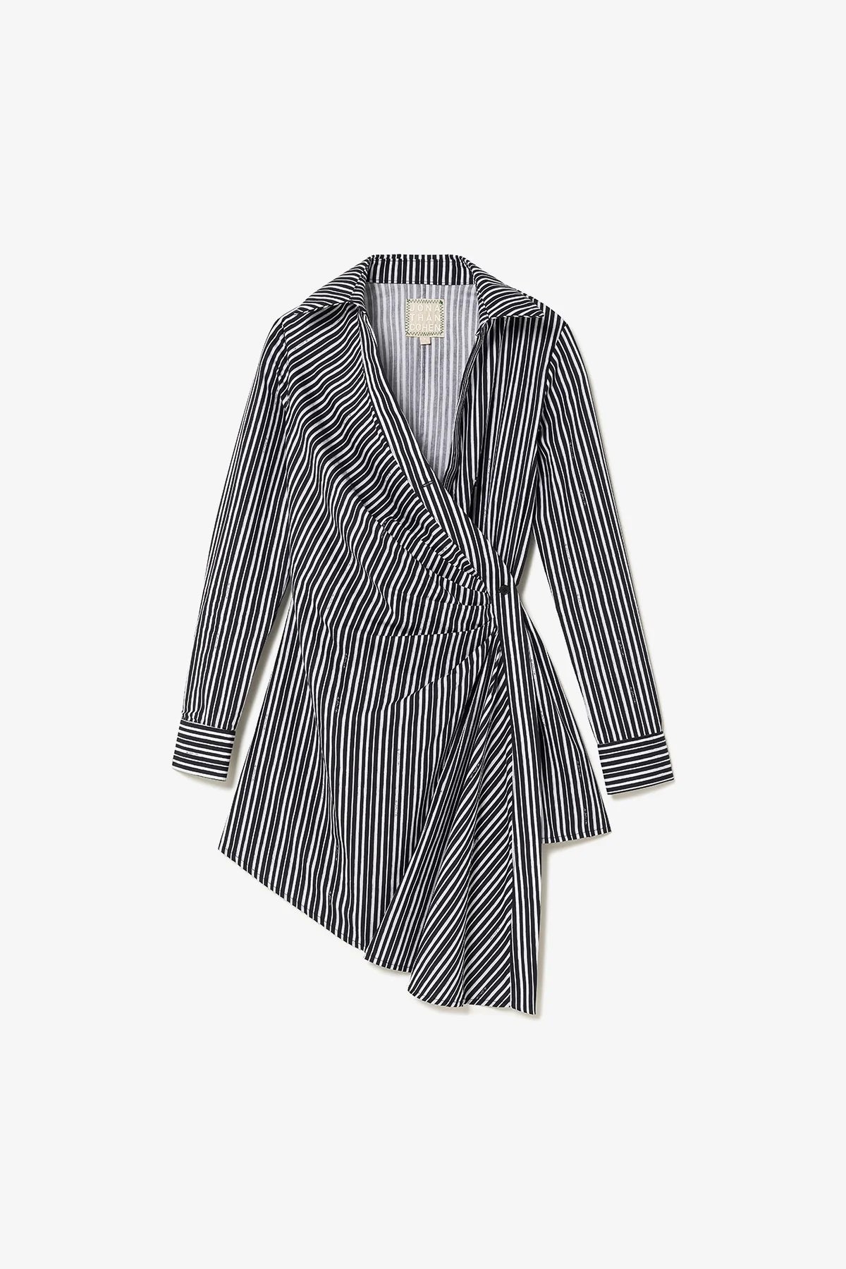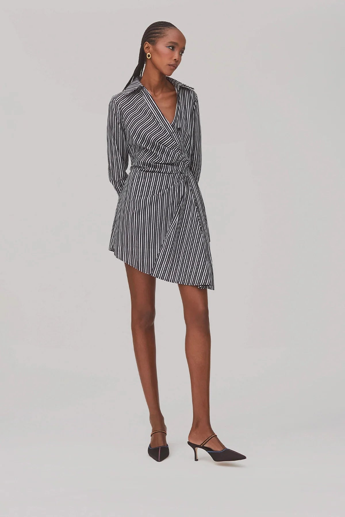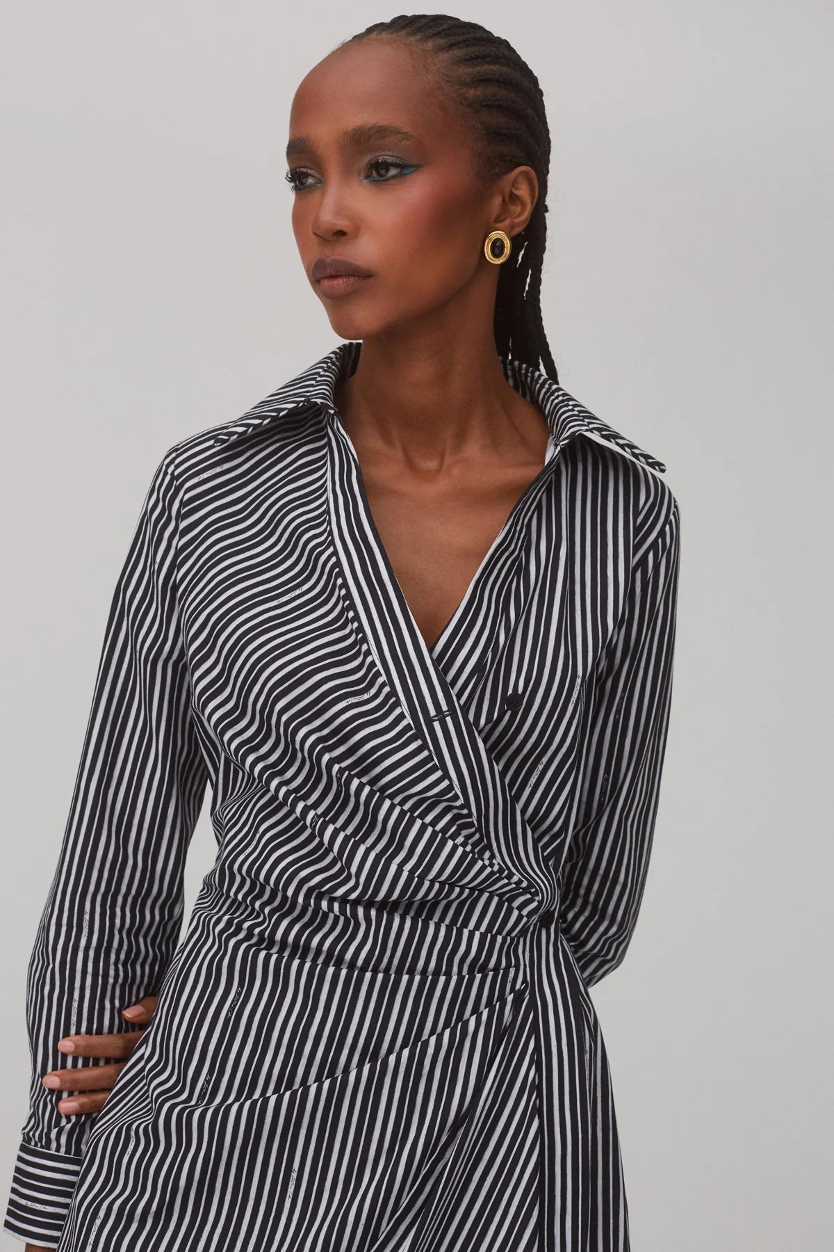 Vestido transpassado em algodão listrado preto e branco, com caimento leve e ajuste regulável ao corpo. A modelagem transpassada valoriza a silhueta de forma natural, garantindo conforto e versatilidade para diferentes momentos do dia.