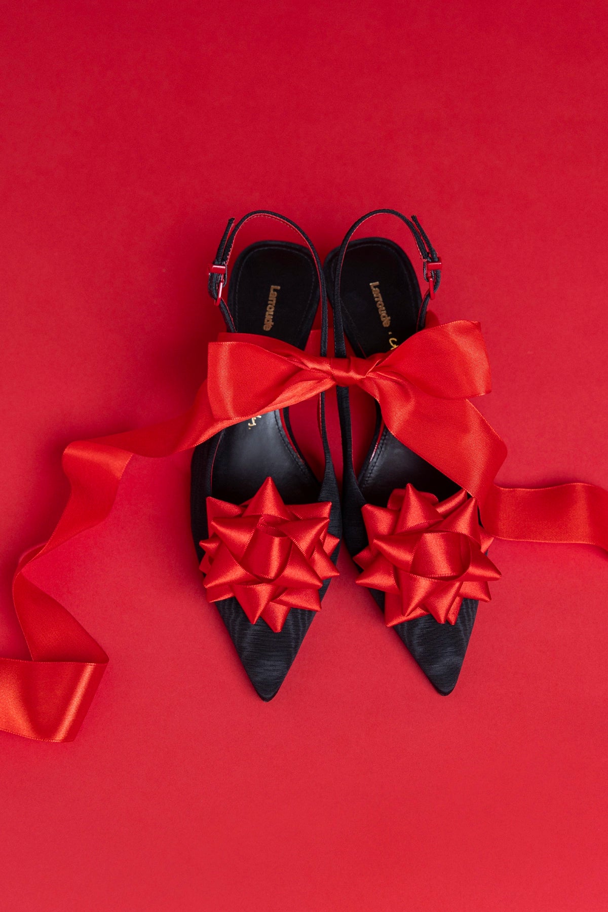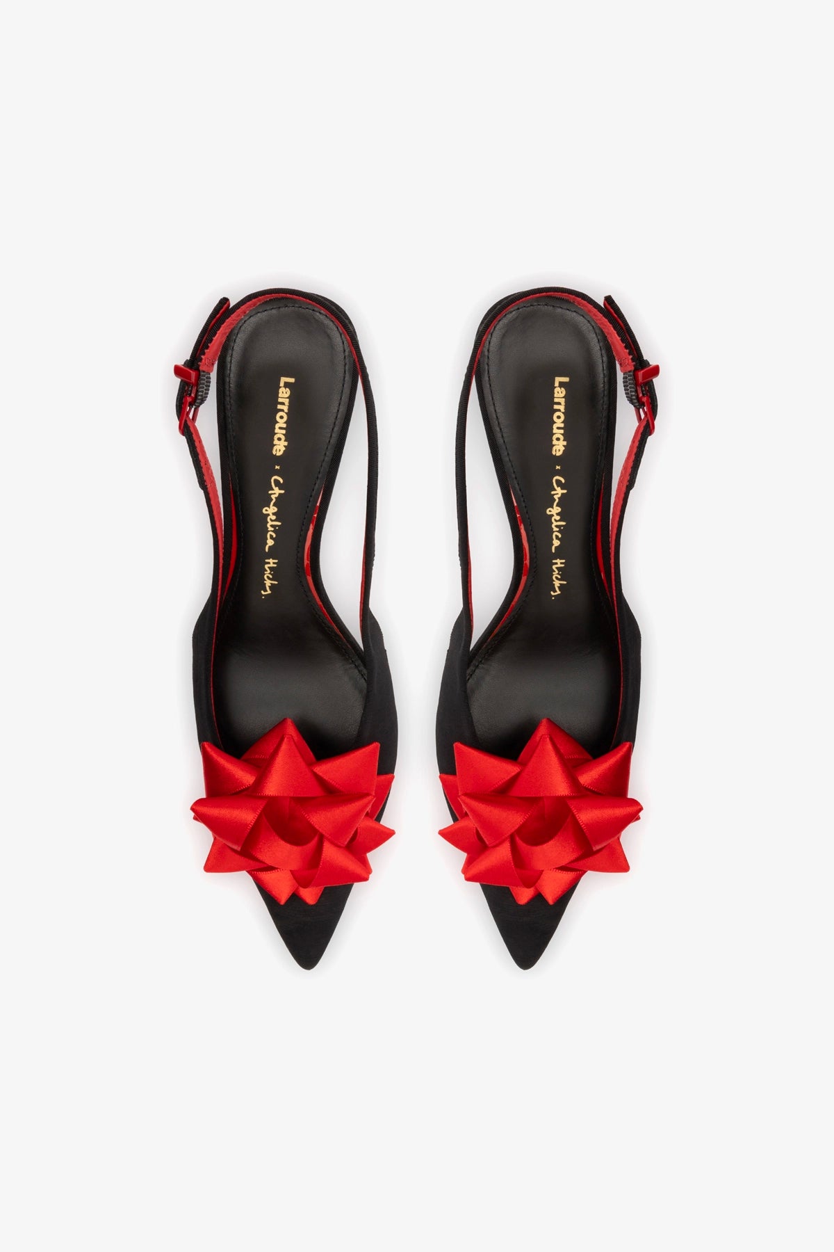 Larroudé x Angelica Hicks: Slingback Bow Seda Preto e Cetim Vermelho