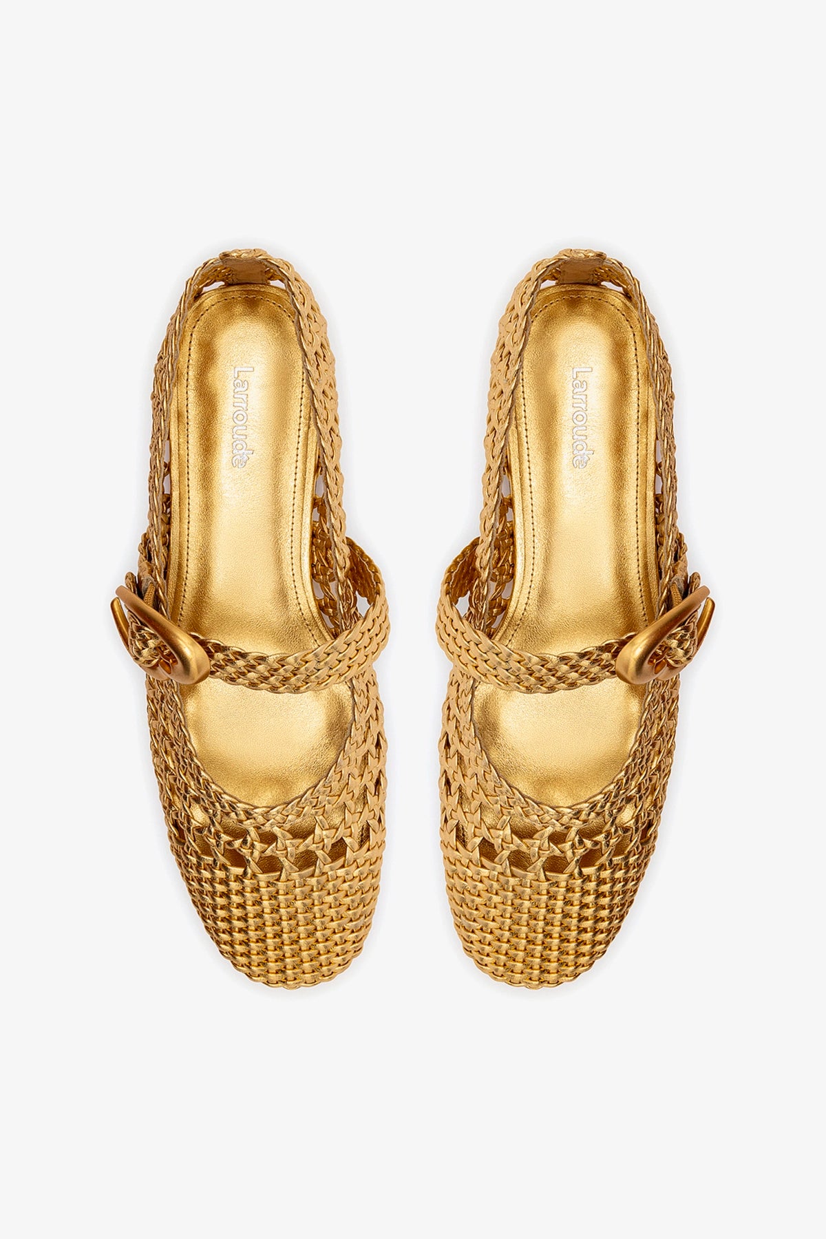 Nossa sapatilha ballerina mais confortável, a mary-jane Verona é inspirada em um romance shakespeariano. Em macramê de couro e uma fivela de coração super delicada, esse reluzente modelo dourado é um sopro de ar fresco para os dias quentes.
