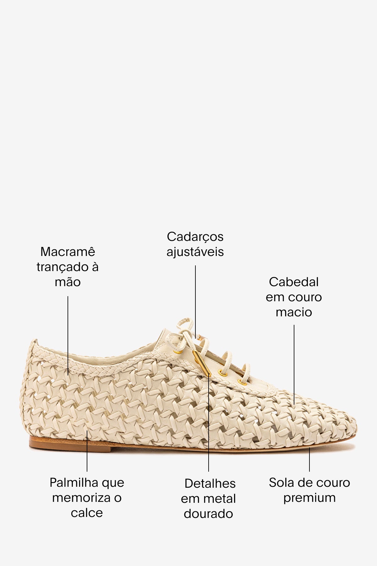 Inspirado na tendência dos jazz shoes, o Liza traz a leveza e a estética minimalista dos clássicos de dança para o dia a dia. Agora em macramê de couro trançado à mão e com cadarços delicados, é o par que une conforto absoluto e um design cool e atual.