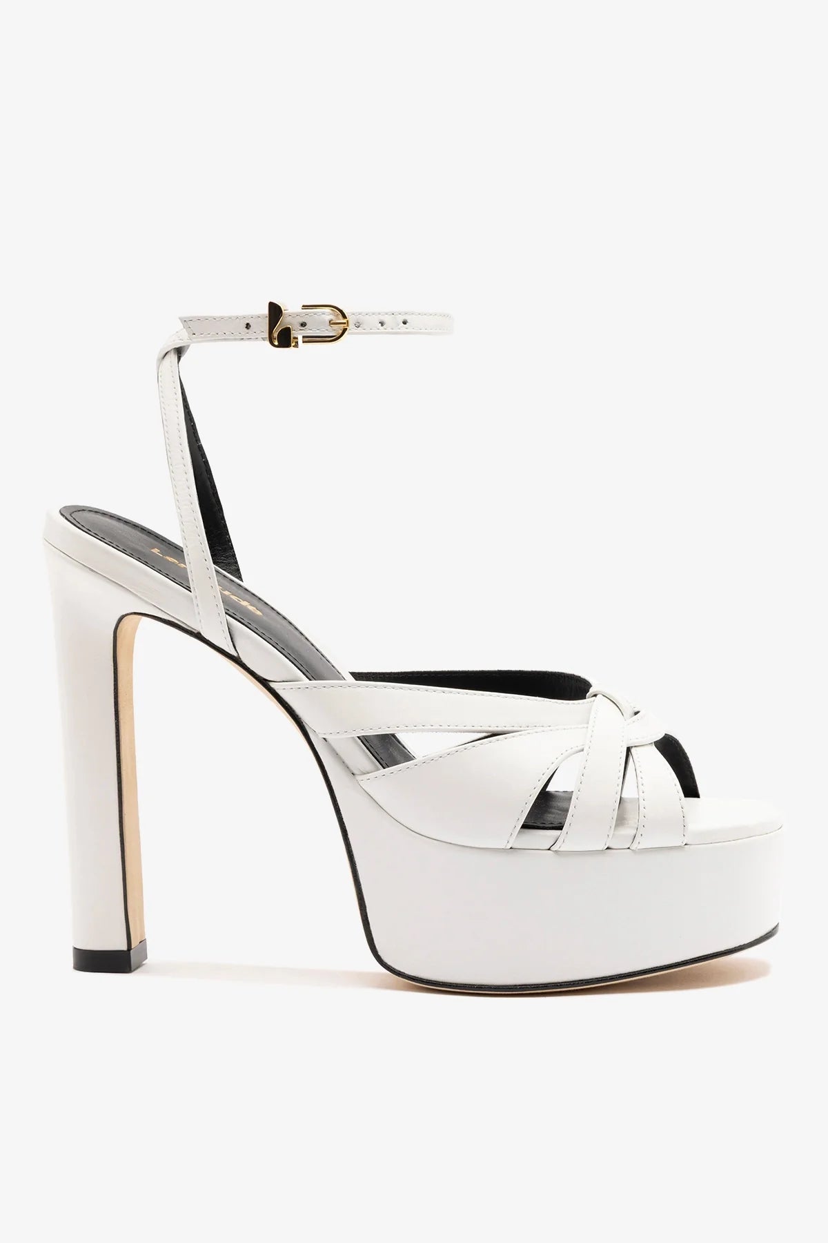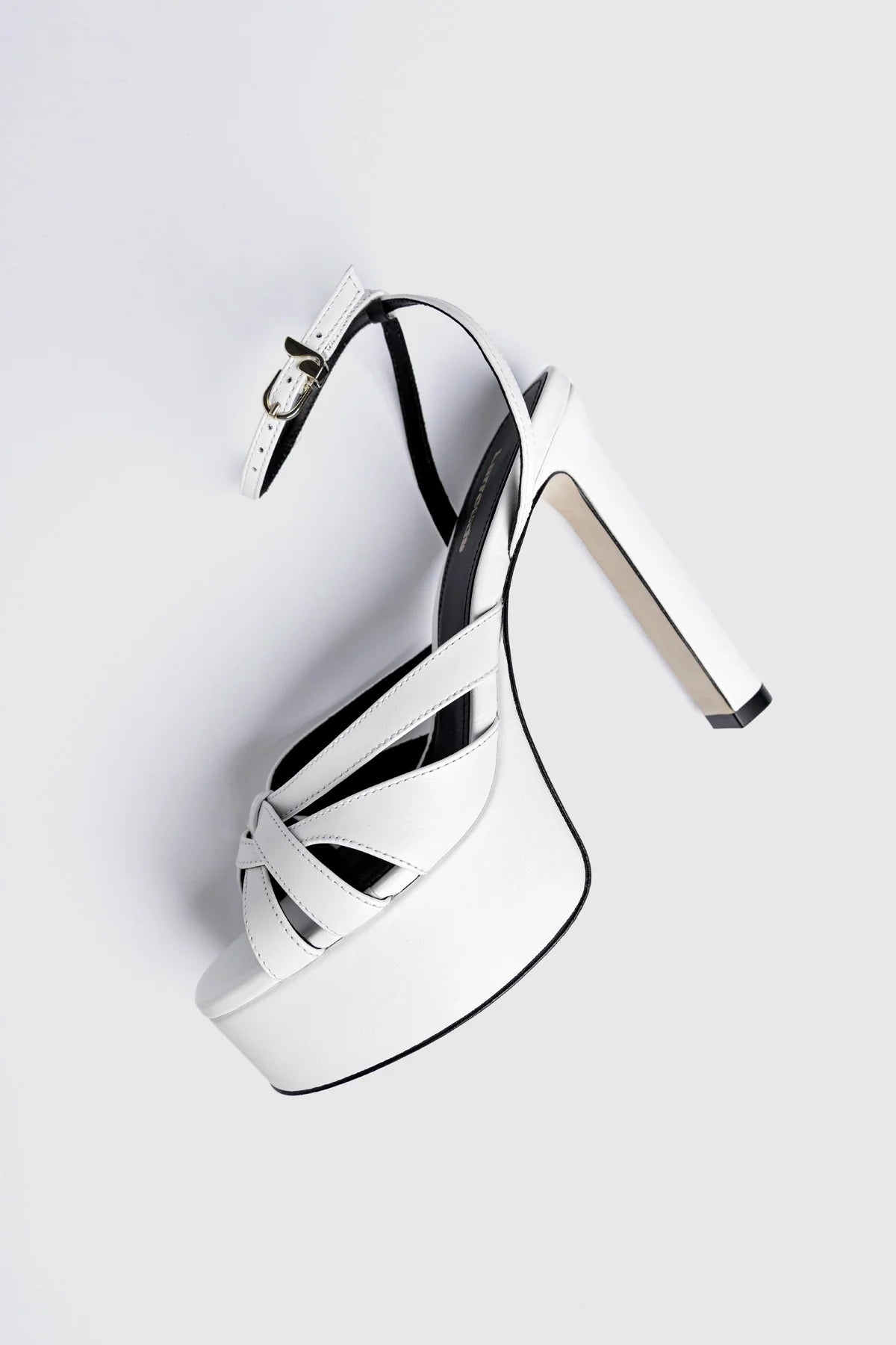 Sandália de plataforma em couro branco, com salto bloco alto e design de tiras que envolvem o pé com firmeza. O acabamento traz impacto visual, enquanto a plataforma equilibra altura e estabilidade para produções mais marcantes.