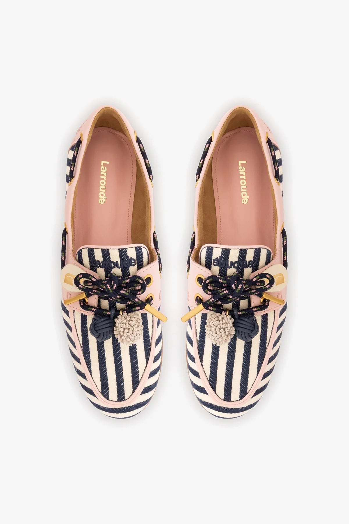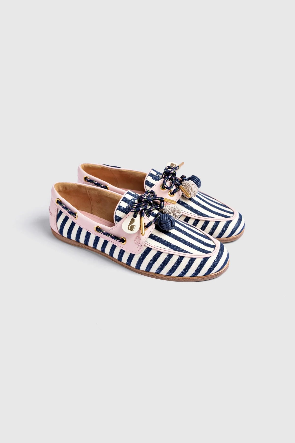 Mocassim Boat Shoe Cyprus Lona Listrada Azul e Couro Rosa