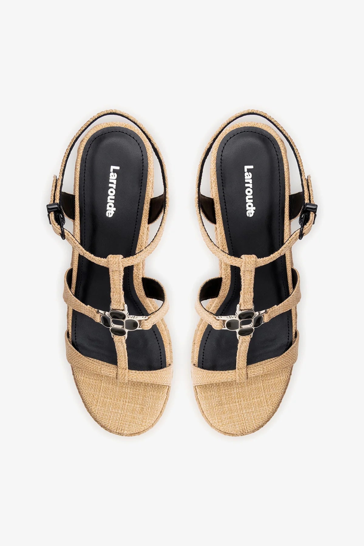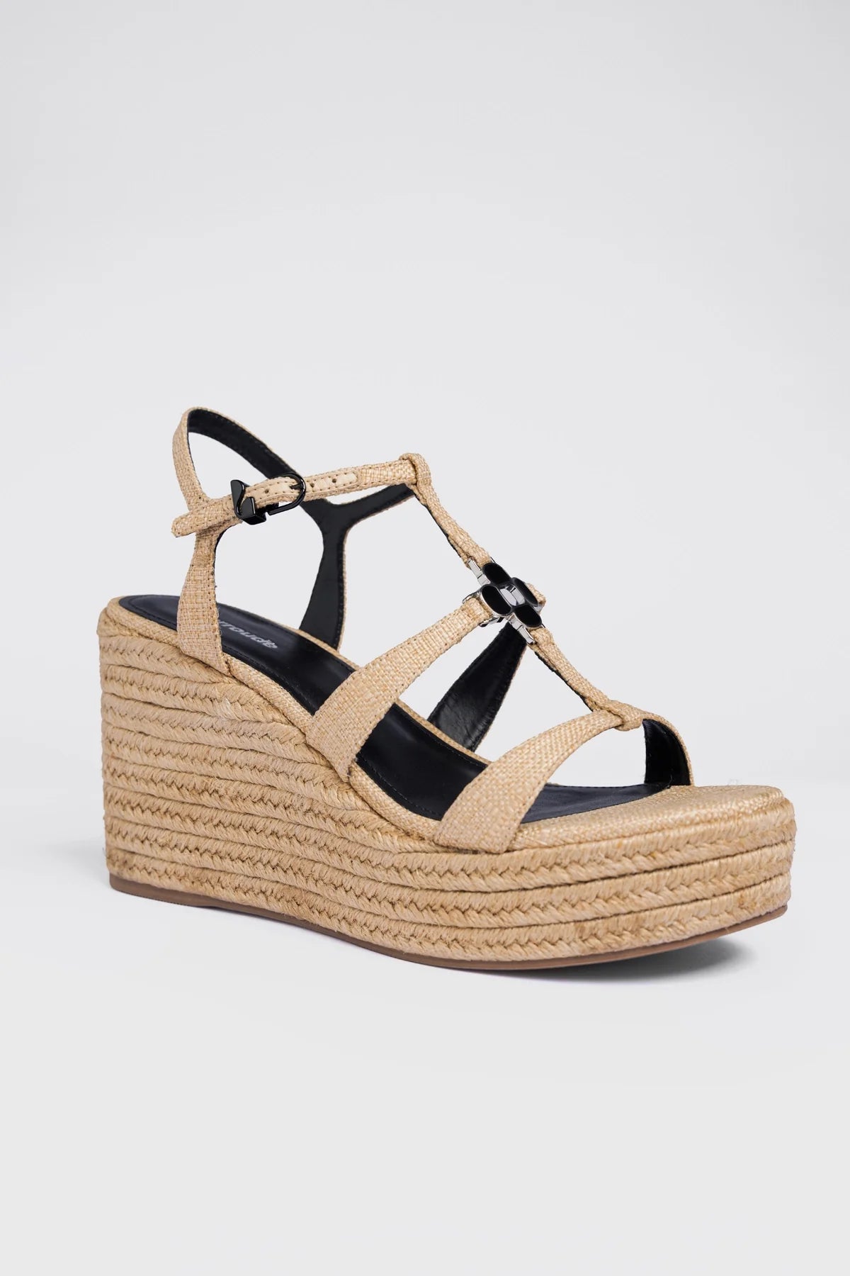 Sandália espadrille anabela em ráfia bege, com plataforma em corda natural que traz textura e leveza ao visual. As tiras estruturadas e o fechamento no tornozelo garantem ajuste seguro, enquanto o salto anabela oferece conforto para o uso prolongado.