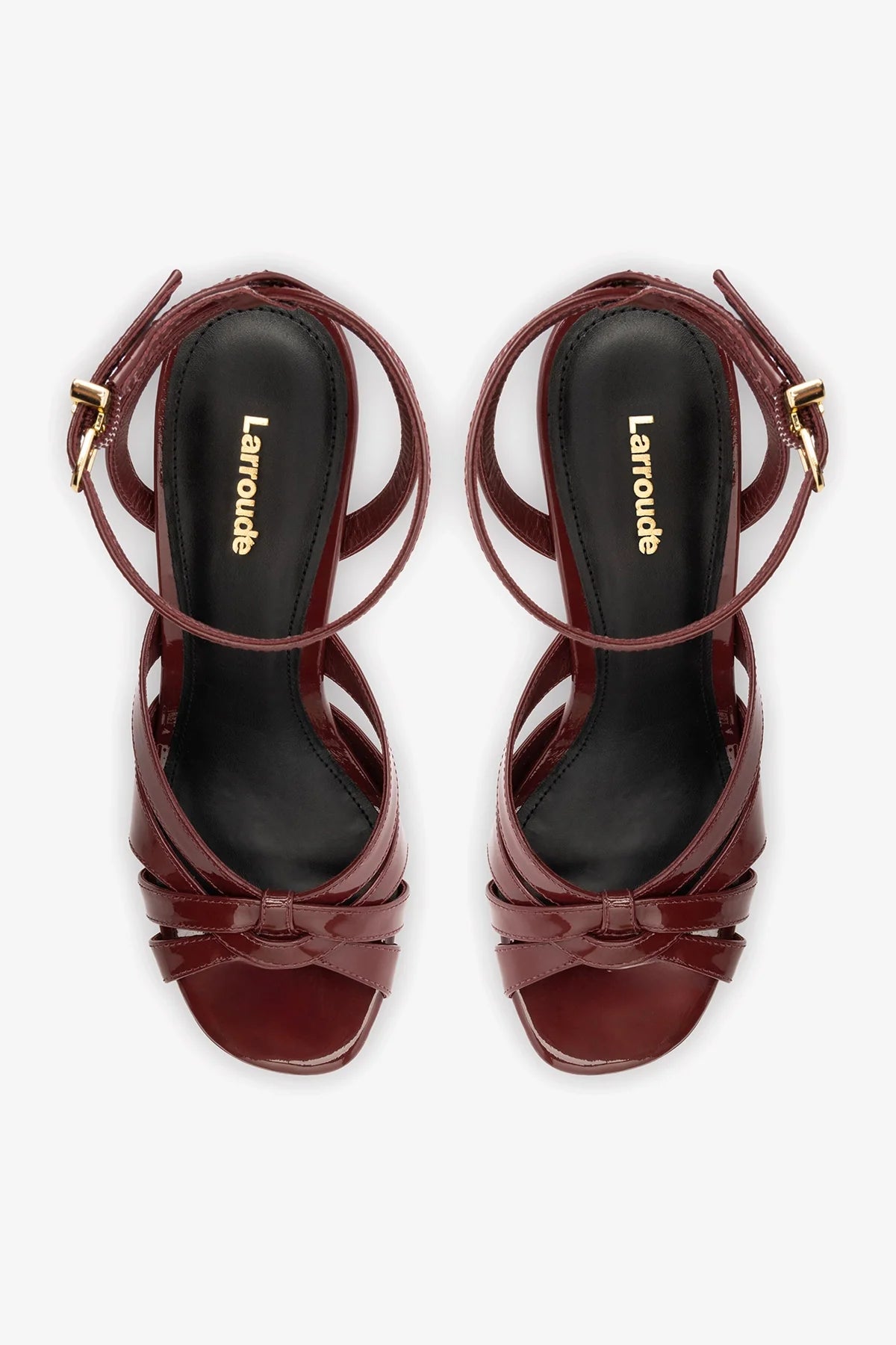 Sandália de plataforma em couro bordô envernizado, com salto bloco alto e design de tiras que envolvem o pé com firmeza. O acabamento em verniz traz impacto visual, enquanto a plataforma equilibra altura e estabilidade para produções mais marcantes.