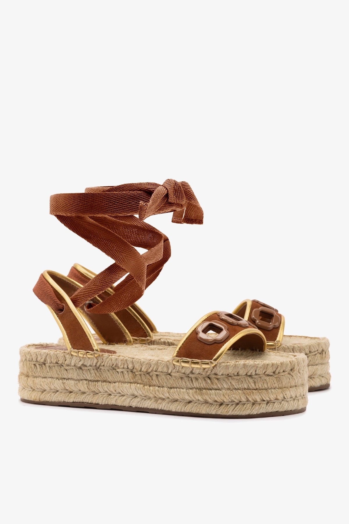 Nossa silhueta mais icônica surge na versão espadrille flatform, mantendo o DNA que a consagrou: acabamento sofisticado, conforto e, claro, os detalhes metálicos que são sua marca registrada. Com uma base flatform em corda trançada e tira em camurça caramelo, essa espadrille traz o equilíbrio perfeito para um look rústico e refinado. A amarração no tornozelo reforça o toque artesanal e garante ajuste firme.