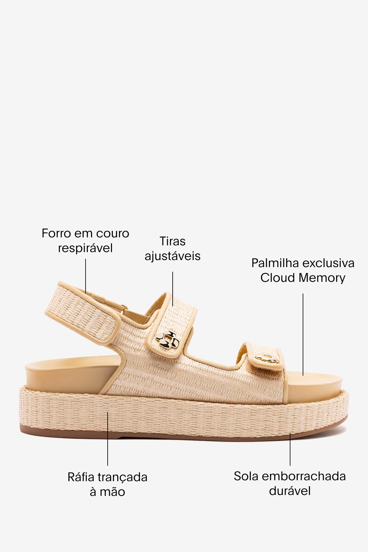 Jetty traz uma proposta leve e prática, perfeita para os dias de calor. A plataforma trançada cria um visual moderno e fácil de usar, enquanto o detalhe metálico discreto adiciona um toque final sutil.