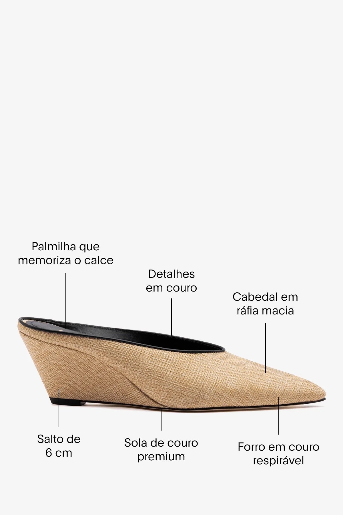 Mule de bico fino em ráfia natural, com design clean e salto baixo em cunha que garante conforto no uso diário. A silhueta minimalista alonga o visual e torna a peça fácil de combinar, do casual ao mais alinhado.