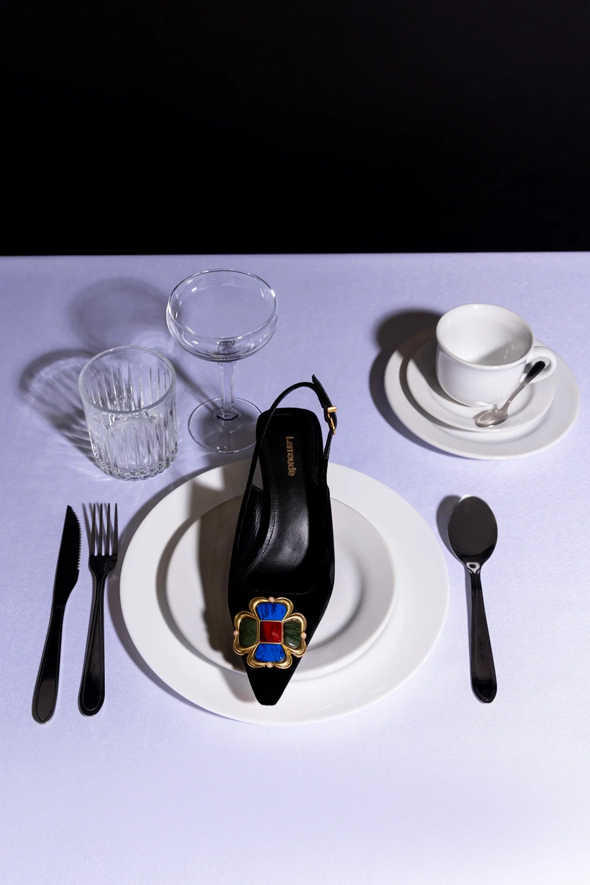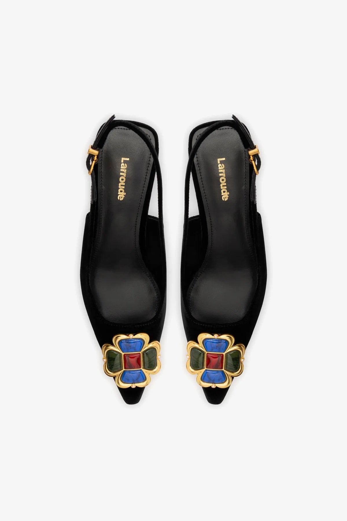 Conheça Chrissy, nosso novo slingback inspirado na alta-costura exuberante de Christian Lacroix nos anos 1980 – pense em texturas ricas, detalhes ousados e glamour infinito. Feito em veludo premium e finalizado com um adorno escultural, foi feito para roubar a cena (e talvez alguns corações pelo caminho).