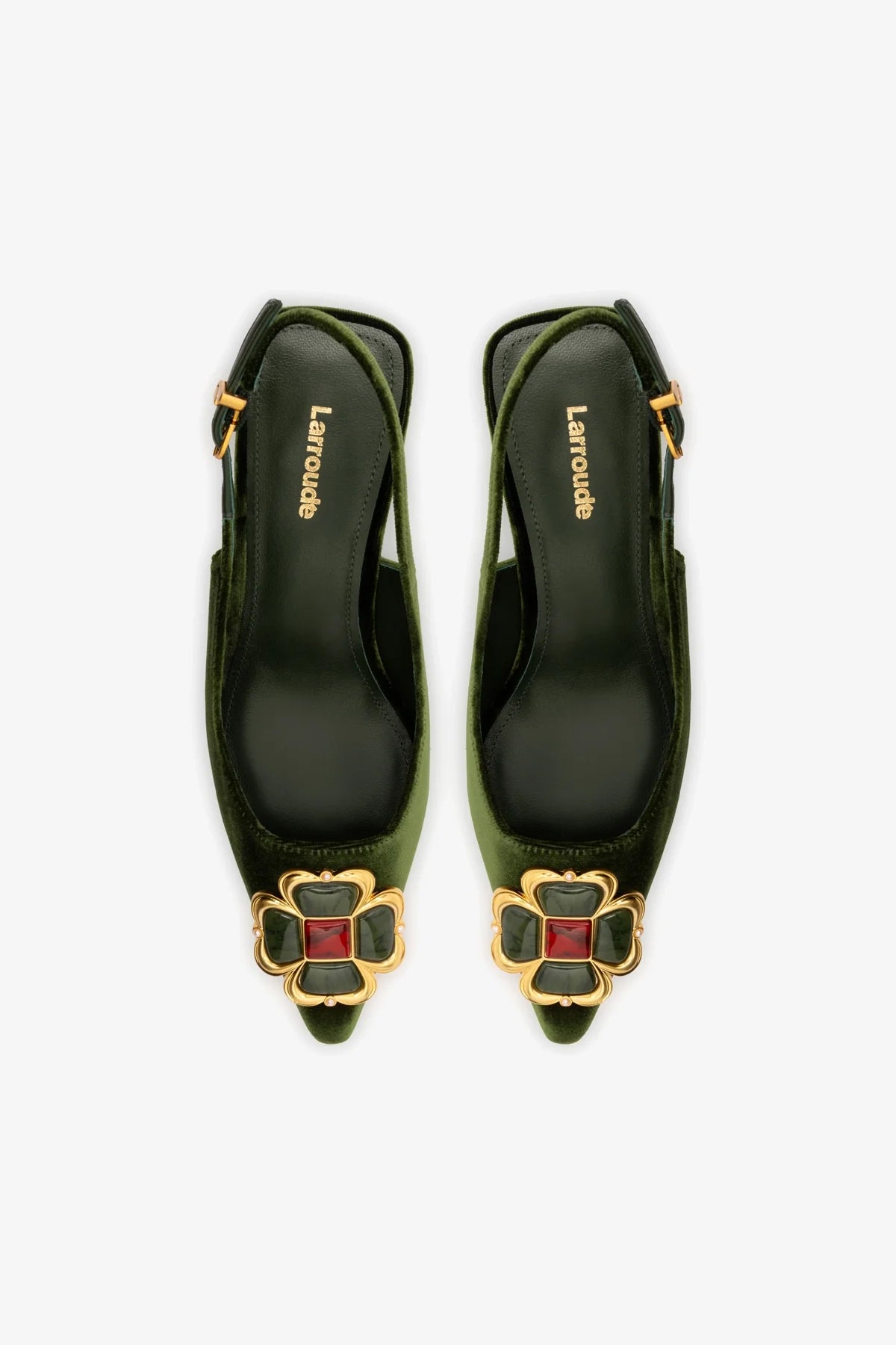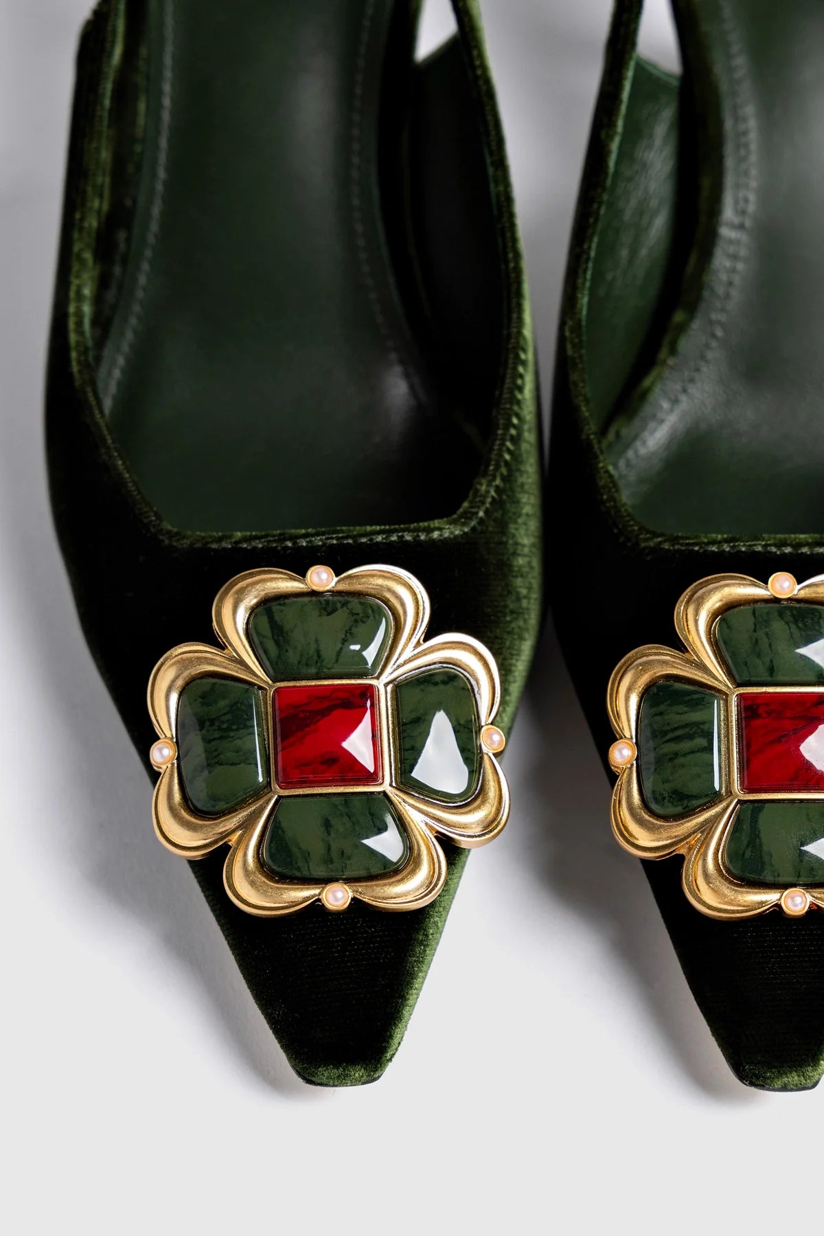 Conheça Chrissy, nosso novo slingback inspirado na alta-costura exuberante de Christian Lacroix nos anos 1980 – pense em texturas ricas, detalhes ousados e glamour infinito. Feito em veludo premium e finalizado com um adorno escultural, foi feito para roubar a cena (e talvez alguns corações pelo caminho).