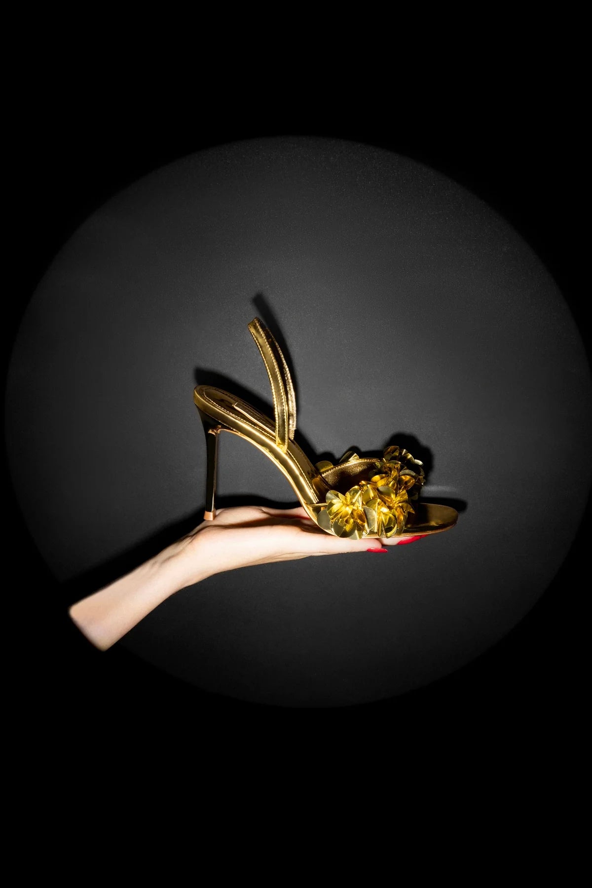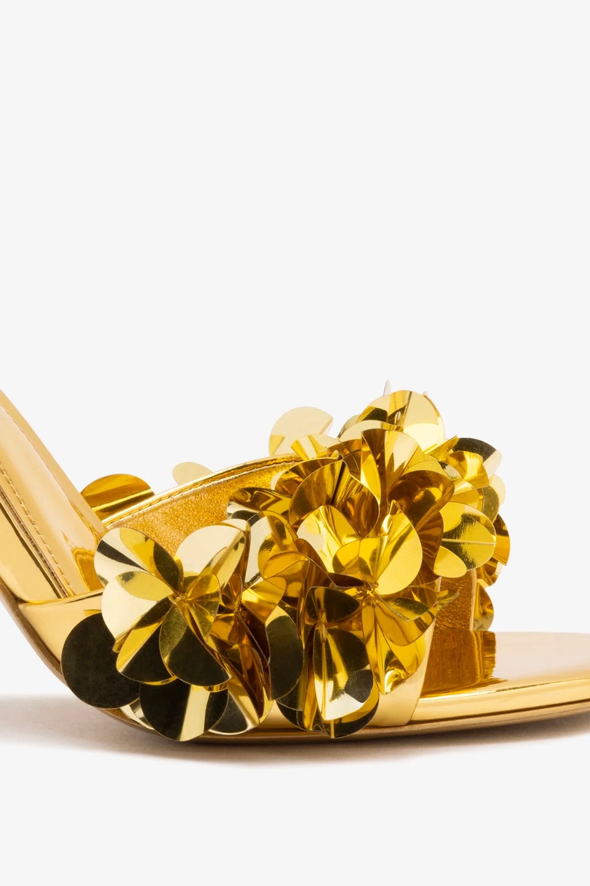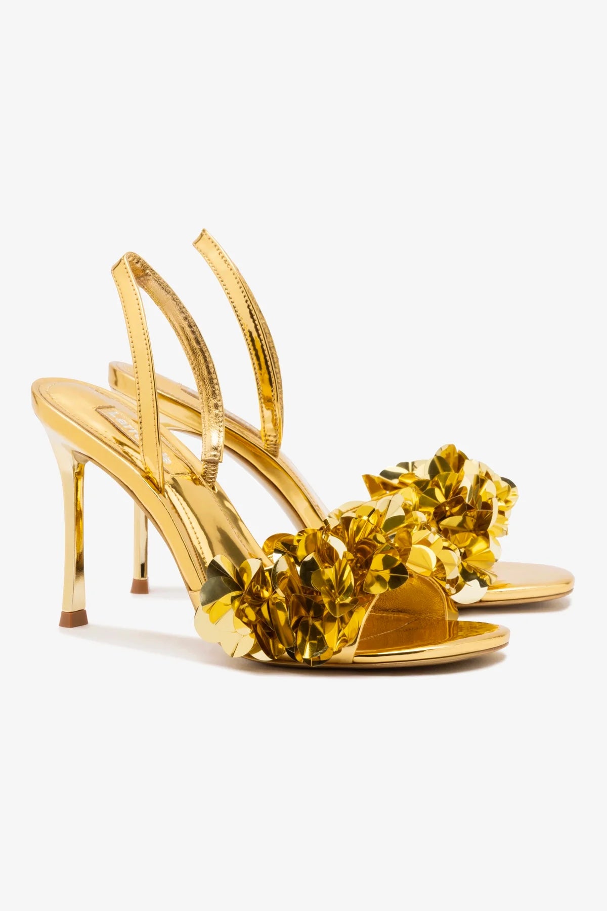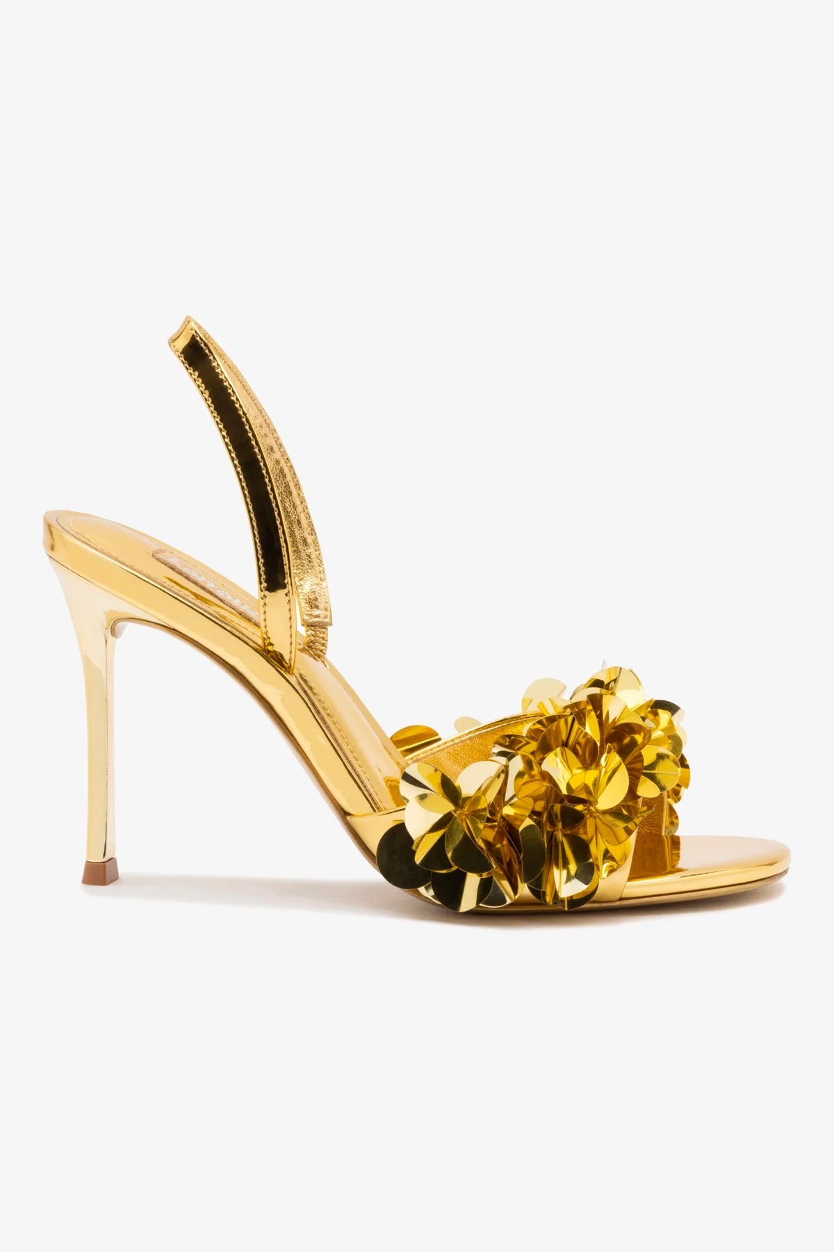 Morgan é pura festa com seu couro espelhado e salto finíssimo. O cabedal em lantejoulas maxi bordadas à mão transformam essa sandália no toque perfeito para o seu look de festas.