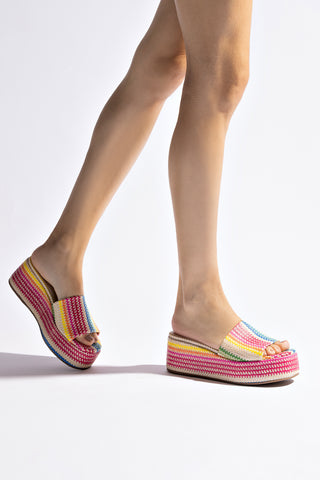 Sandália Flat Hana Couro Verniz Multicor e Ráfia Bege