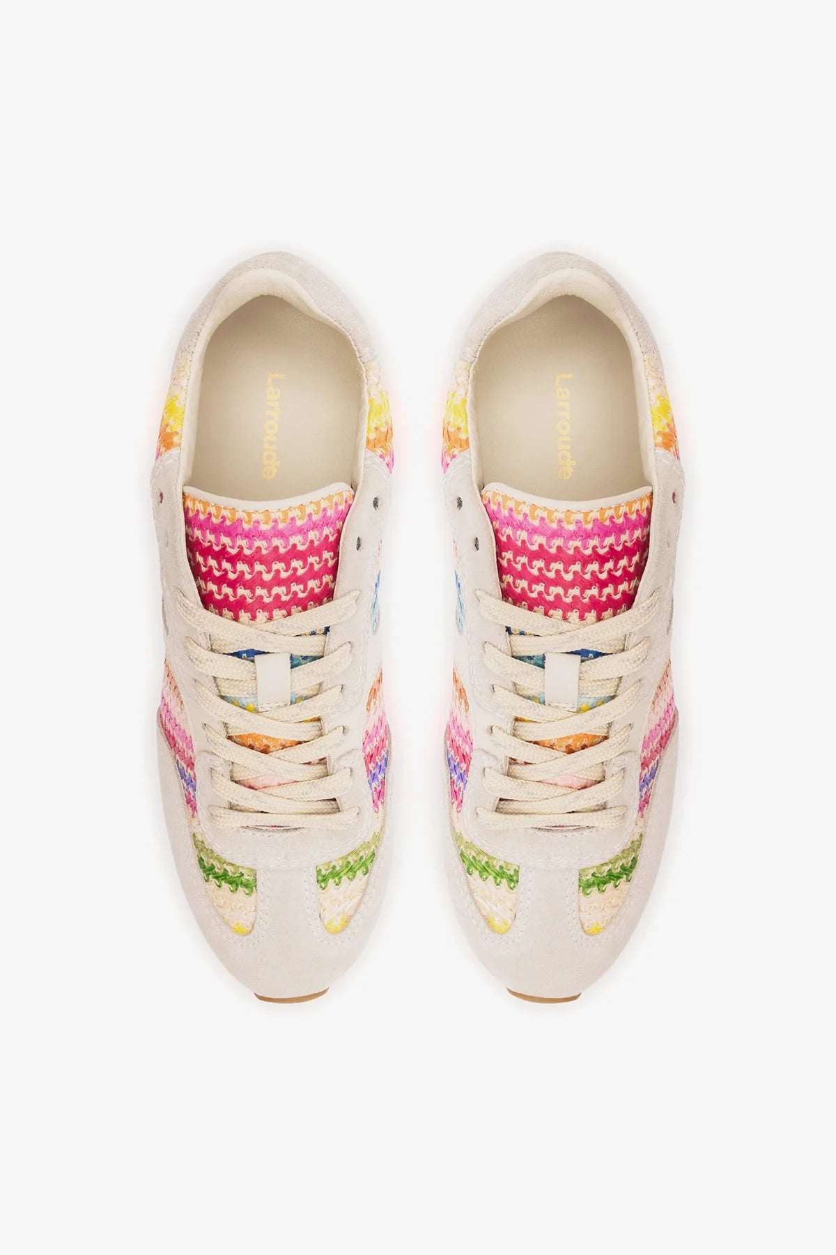 Tênis em ráfia multicor com detalhes em camurça neutra, combinando textura natural e um toque de cor em um design leve e atual. A construção confortável garante uso fácil no dia a dia, enquanto o efeito rainbow traz personalidade ao visual.