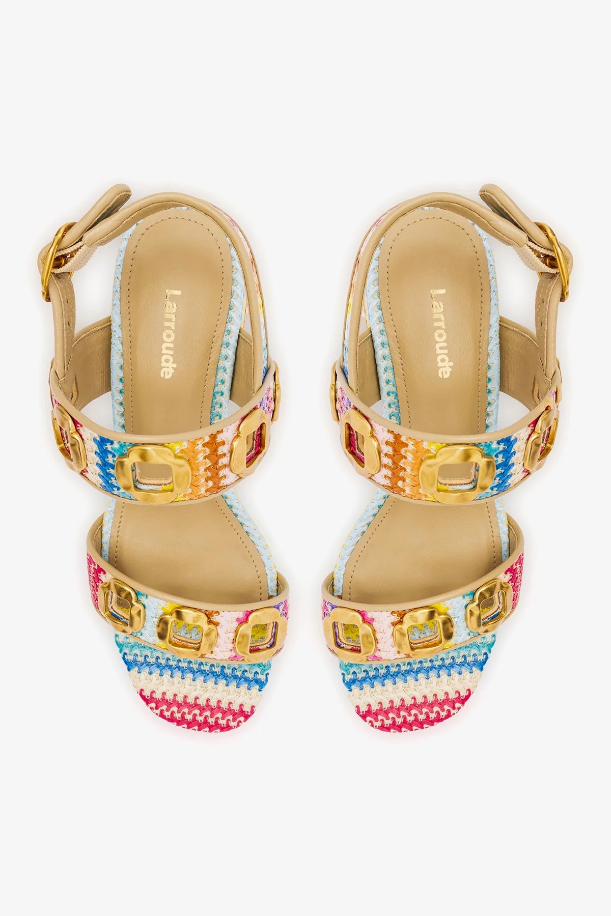 A sandália Milan ganha uma nova versão que atualiza um dos best sellers da Larroudé. Tiras em ráfia arco-íris com as fivelas características do modelo contrastam com o acabamento em couro natural, enquanto o salto bloco garante conforto e estabilidade para o dia a dia.
