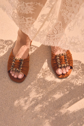 Sandália Flat Milan Camurça Caramelo e Tachas Dourado