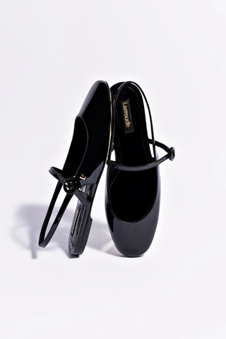 Larroudé x Jonathan Cohen: Mule Greta Couro Verniz Preto e Franjas