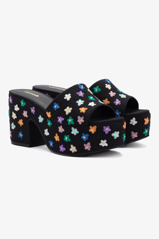 Mule Plataforma Miso Linho Preto com Bordado Floral