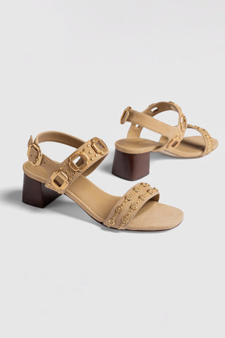 Sandália Salto Bloco Milan Camurça Caramelo e Tachas Dourado