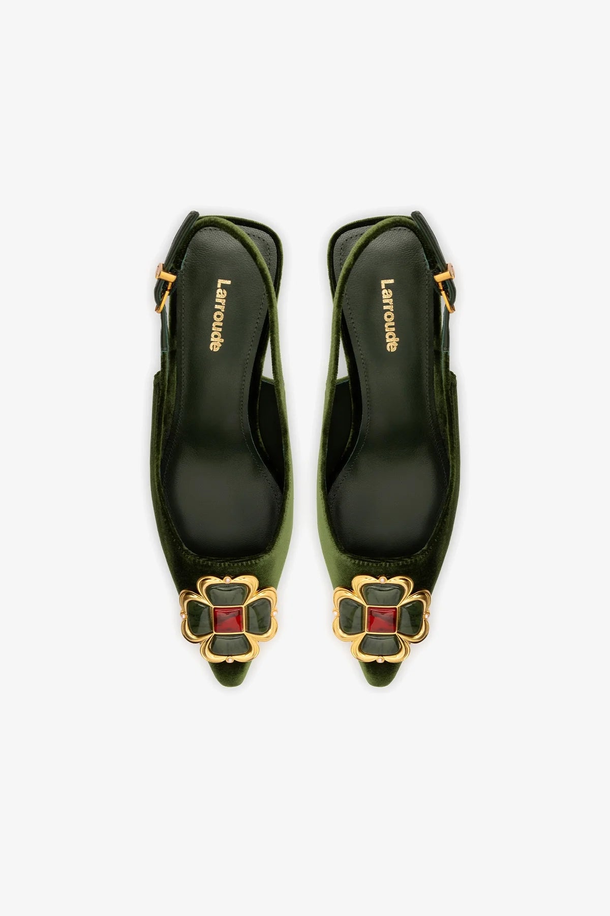Conheça Chrissy, nosso novo slingback inspirado na alta-costura exuberante de Christian Lacroix nos anos 1980 – pense em texturas ricas, detalhes ousados e glamour infinito. Feito em veludo premium e finalizado com um adorno escultural, foi feito para roubar a cena (e talvez alguns corações pelo caminho).
