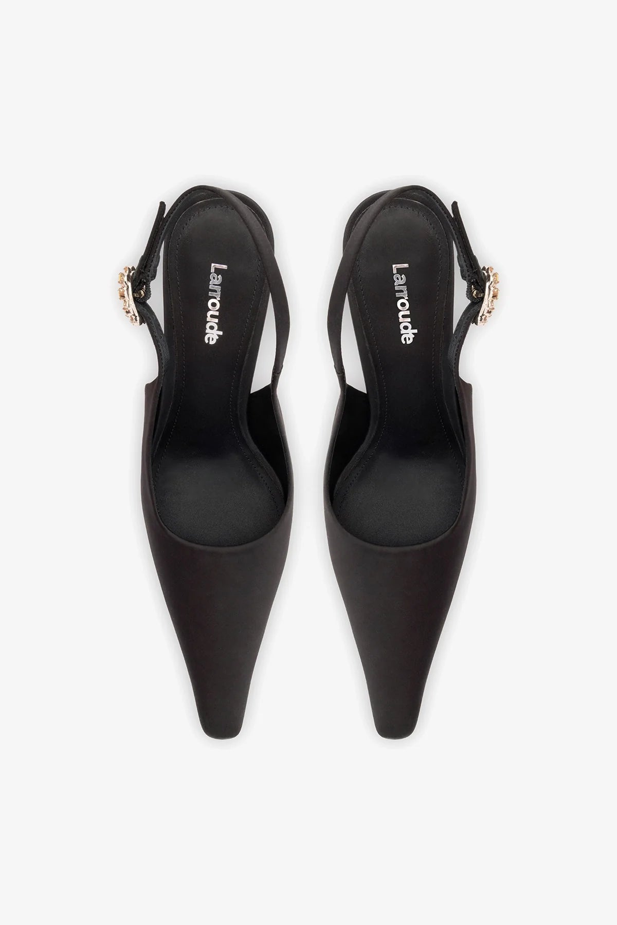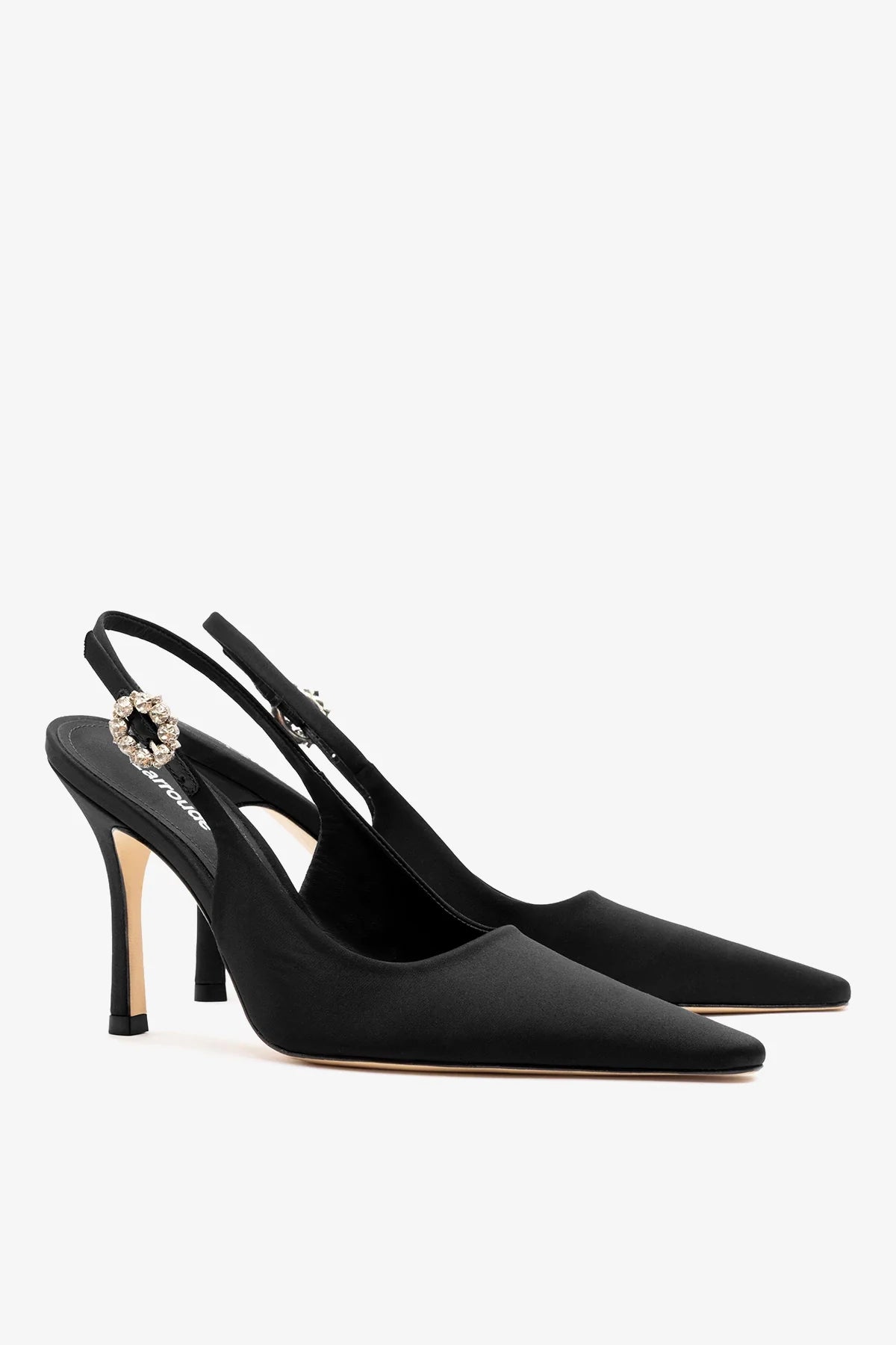 Scarpin slingback em cetim com bico fino e salto alto fino. Possui tira delicada com fivela adornada por cristais, que adiciona um detalhe elegante ao design e garante ajuste seguro.