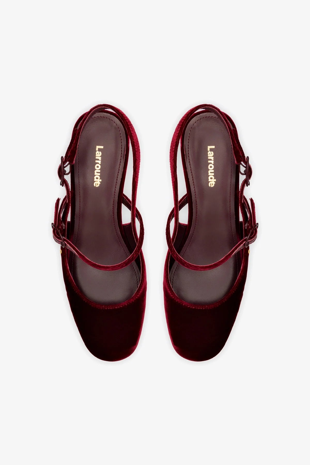 Georgina é a personificação da elegância discreta. Em veludo vinho e com tiras finas que envolvem delicadamente o pé, combina feminilidade clássica com um toque contemporâneo. O salto reto médio garante estabilidade com leveza, e a alça slingback oferece um calce confortável e charmoso.