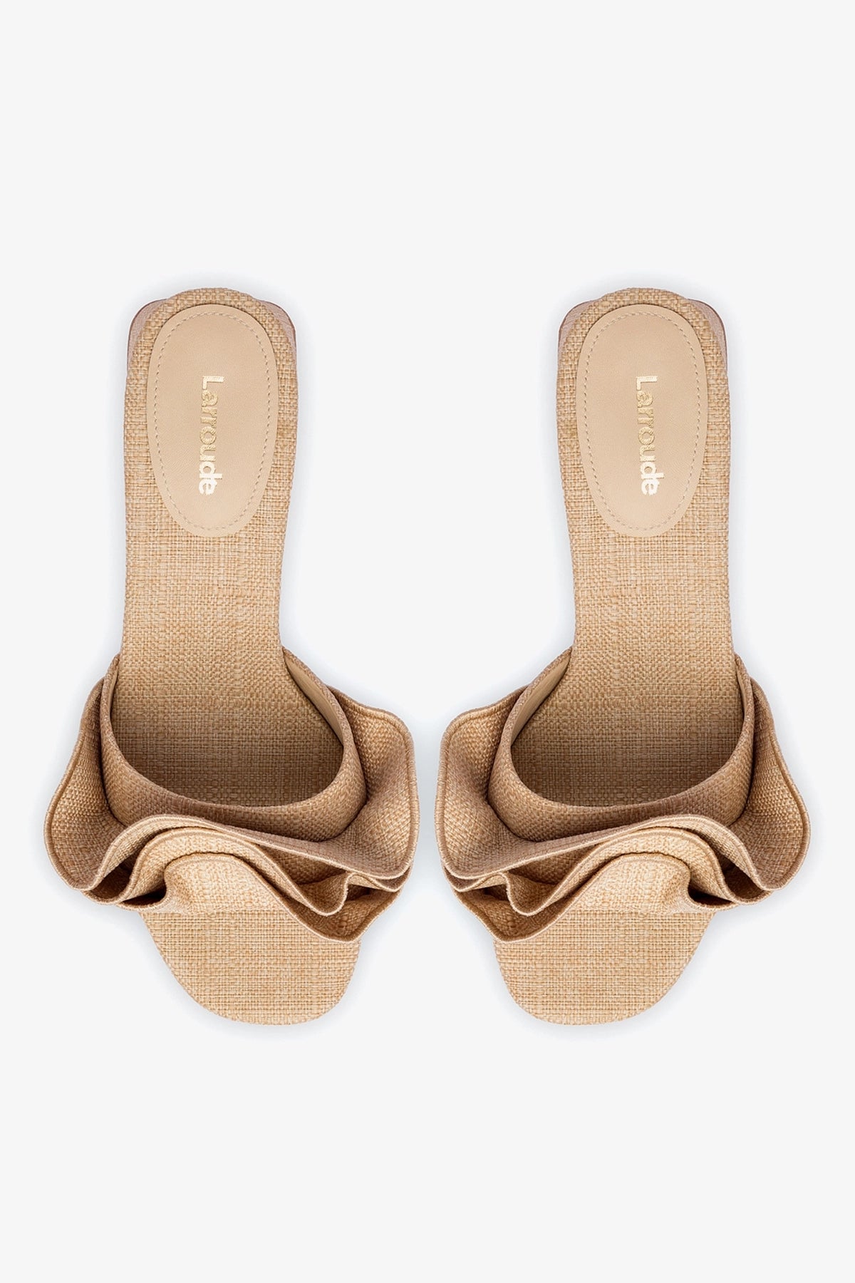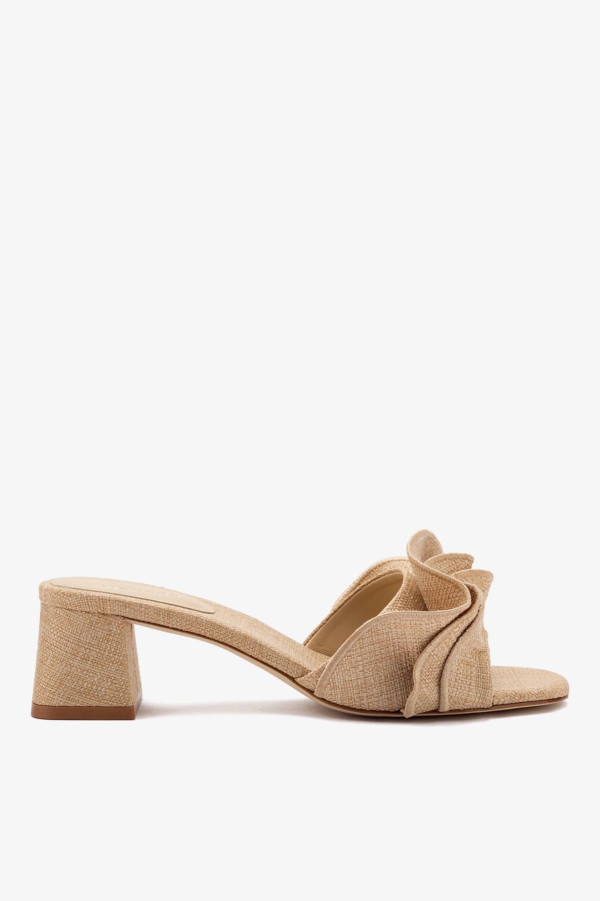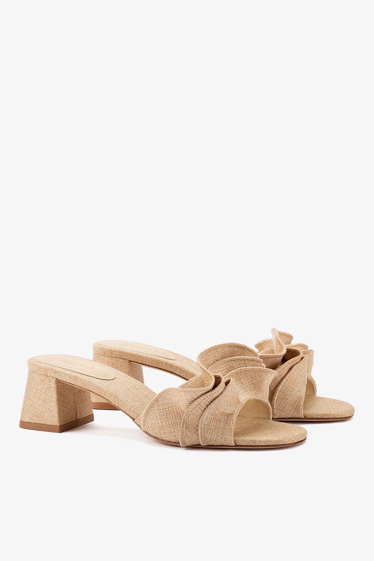 Atualizamos nossa mule favorita com um toque de leveza feminina. Nosso modelo best seller surge com um salto bloco confortável e babados em ráfia, para complementar facilmente o look em qualquer estação.