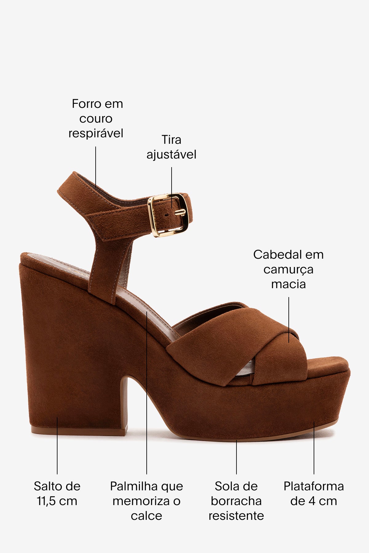 Inspirado nos anos 70 e na atitude icônica de Cher, este modelo traz salto bloco com meia-pata que garante impacto visual e estabilidade. As tiras largas com textura e a fivela no tornozelo reforçam o design marcante, unindo elegância, conforto e um toque retrô atualizado – ideal para produções que pedem presença.