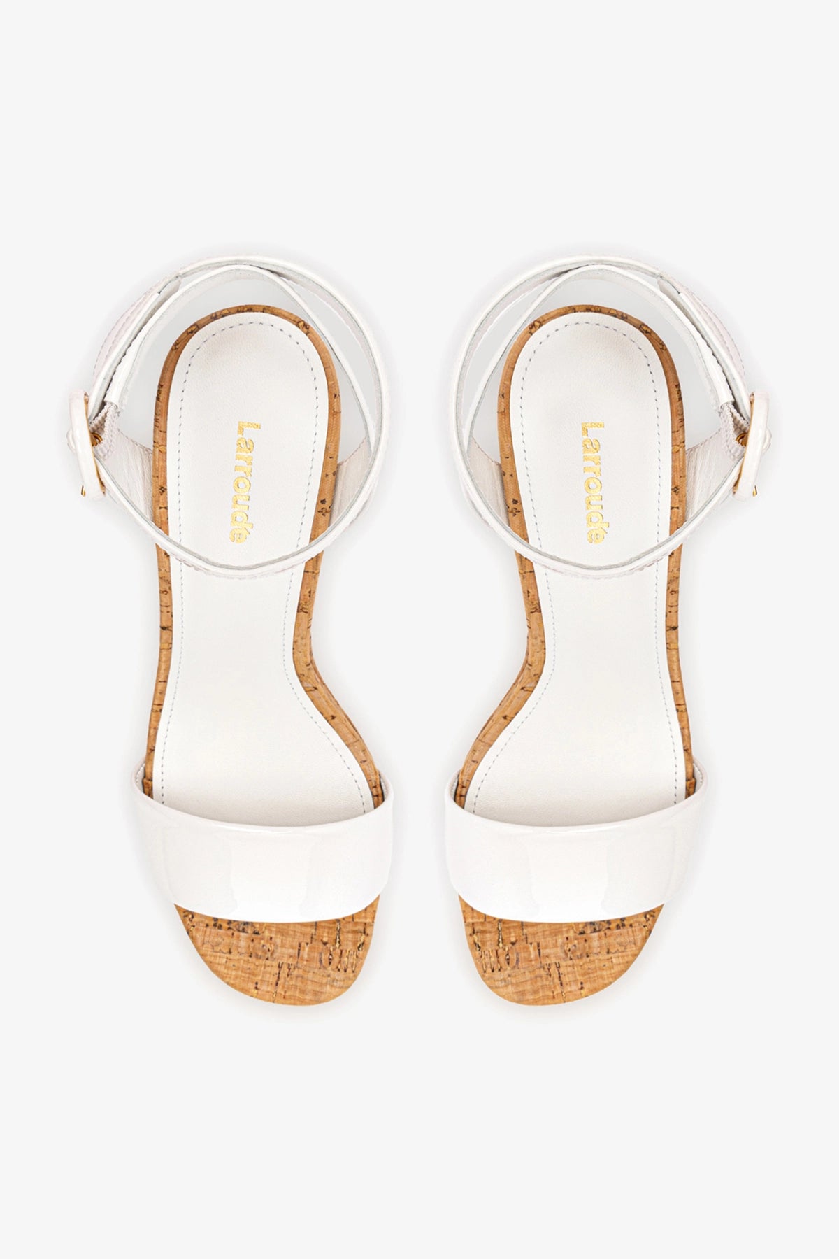 Festiva e chic, essa plataforma que alonga suas pernas deixa você pronta para tudo. Com uma base plataforma confortável e tira ajustável no tornozelo, essa nova versão de Dolly em couro verniz branco e salto em cortiça super retrô é uma opção à prova de erros tanto para o dia quanto para a noite.