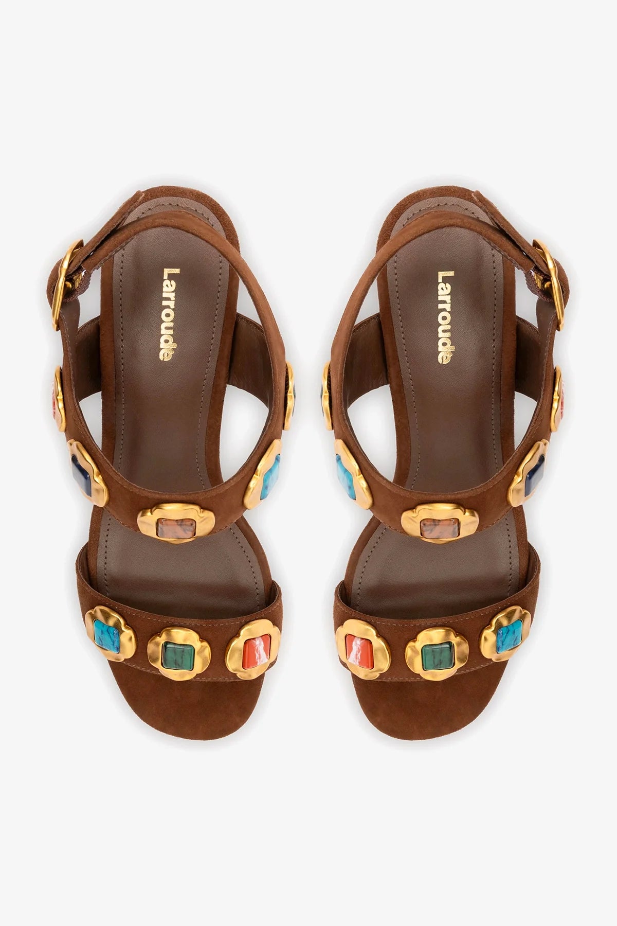 A sandália Milan Gioiello combina um design marcante com um toque artesanal que chama atenção de forma natural. Feita em camurça macia, traz aplicações douradas com pedras coloridas que criam um efeito vibrante e cheio de personalidade, além de um salto bloco super confortável.