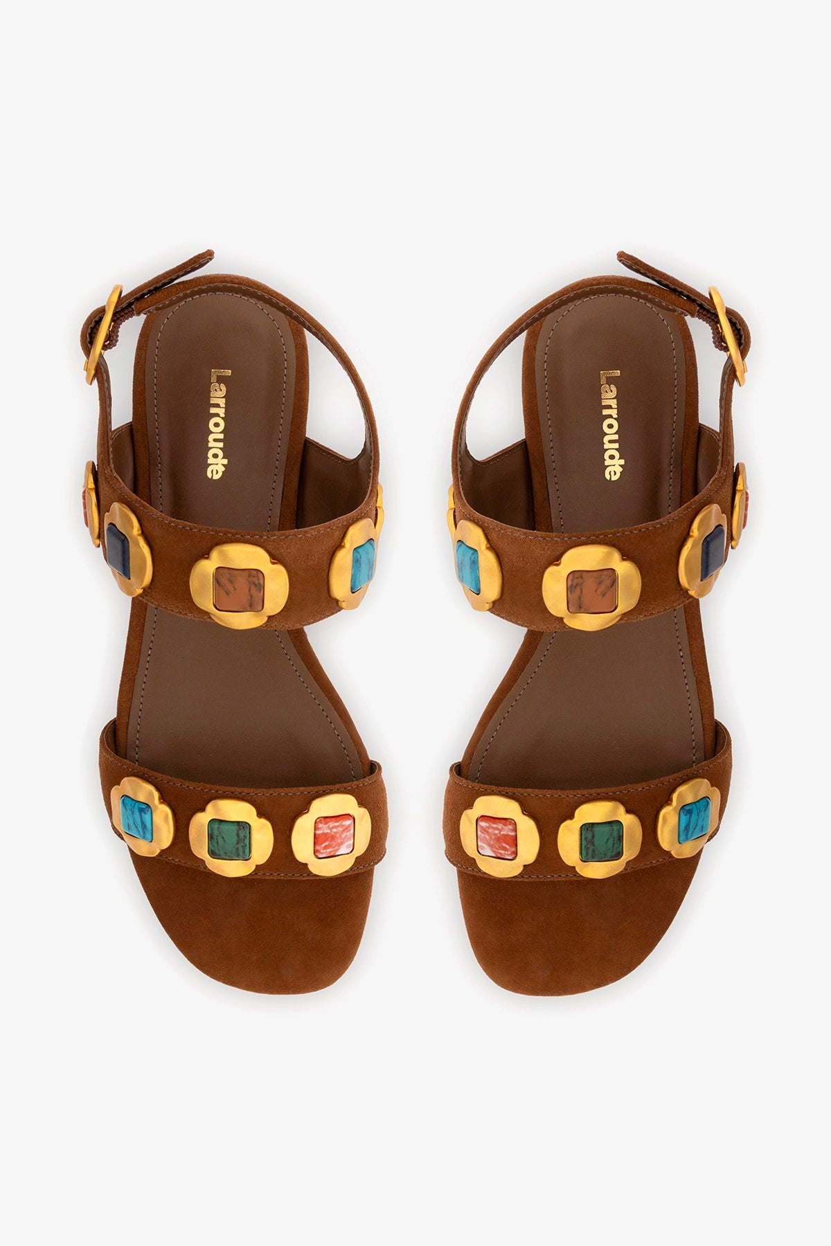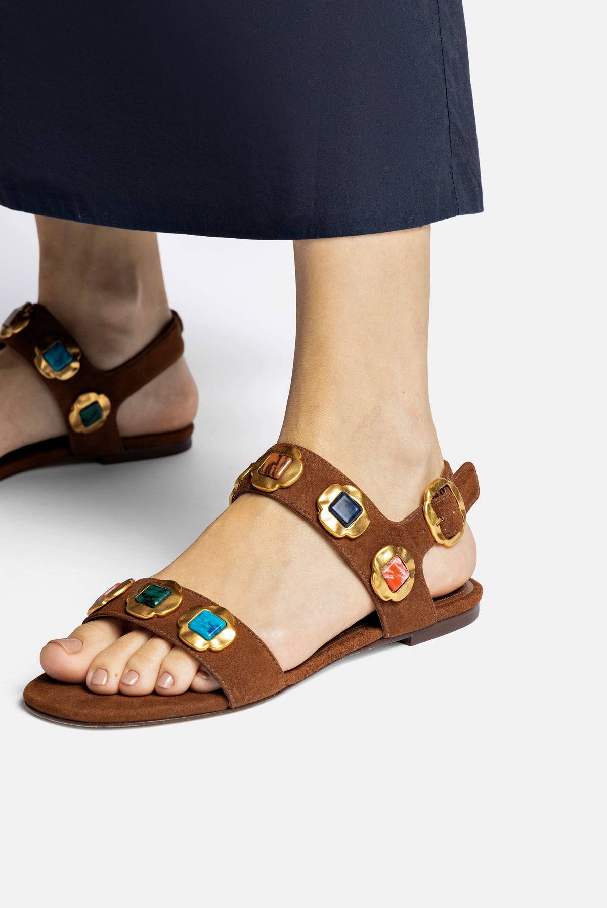 A flat Milan Gioiello combina um design marcante com um toque artesanal que chama atenção de forma natural. Feita em camurça macia, traz aplicações douradas com pedras coloridas que criam um efeito vibrante e cheio de personalidade.