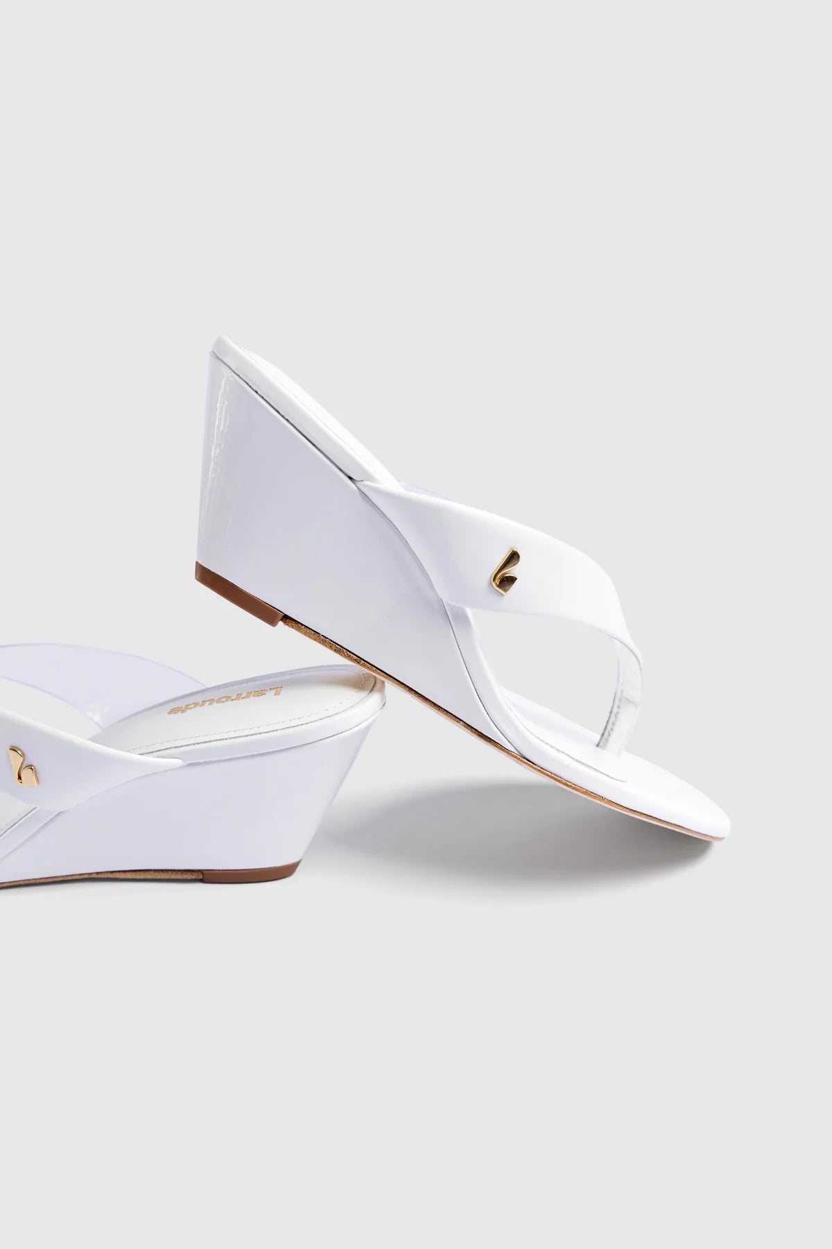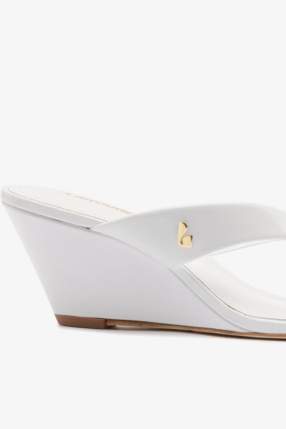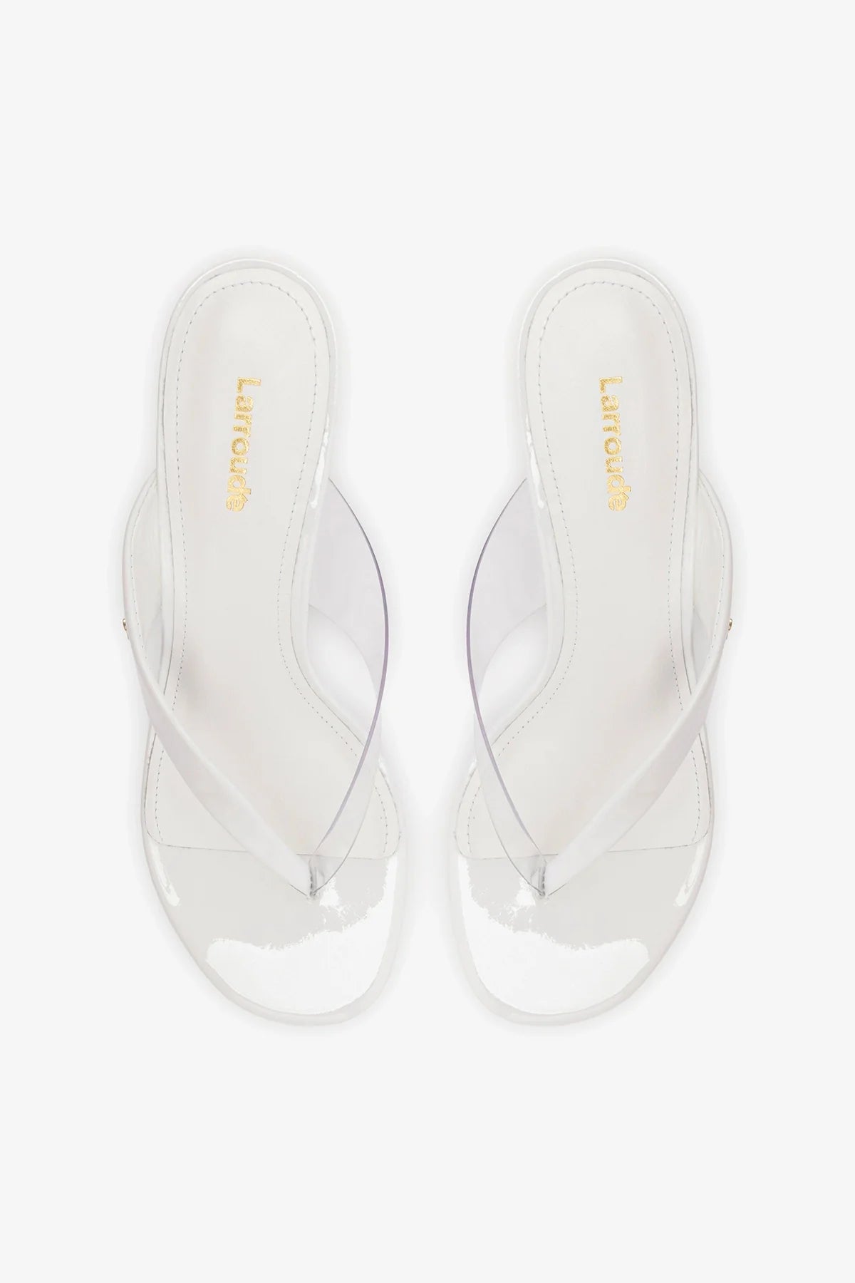 Sandália thong sandal de salto anabela com tiras em vinil transparente e base em couro verniz branco. O contraste entre o brilho do verniz e a leveza do vinil cria um visual moderno, enquanto o salto garante conforto e estabilidade para o uso do dia à noite.