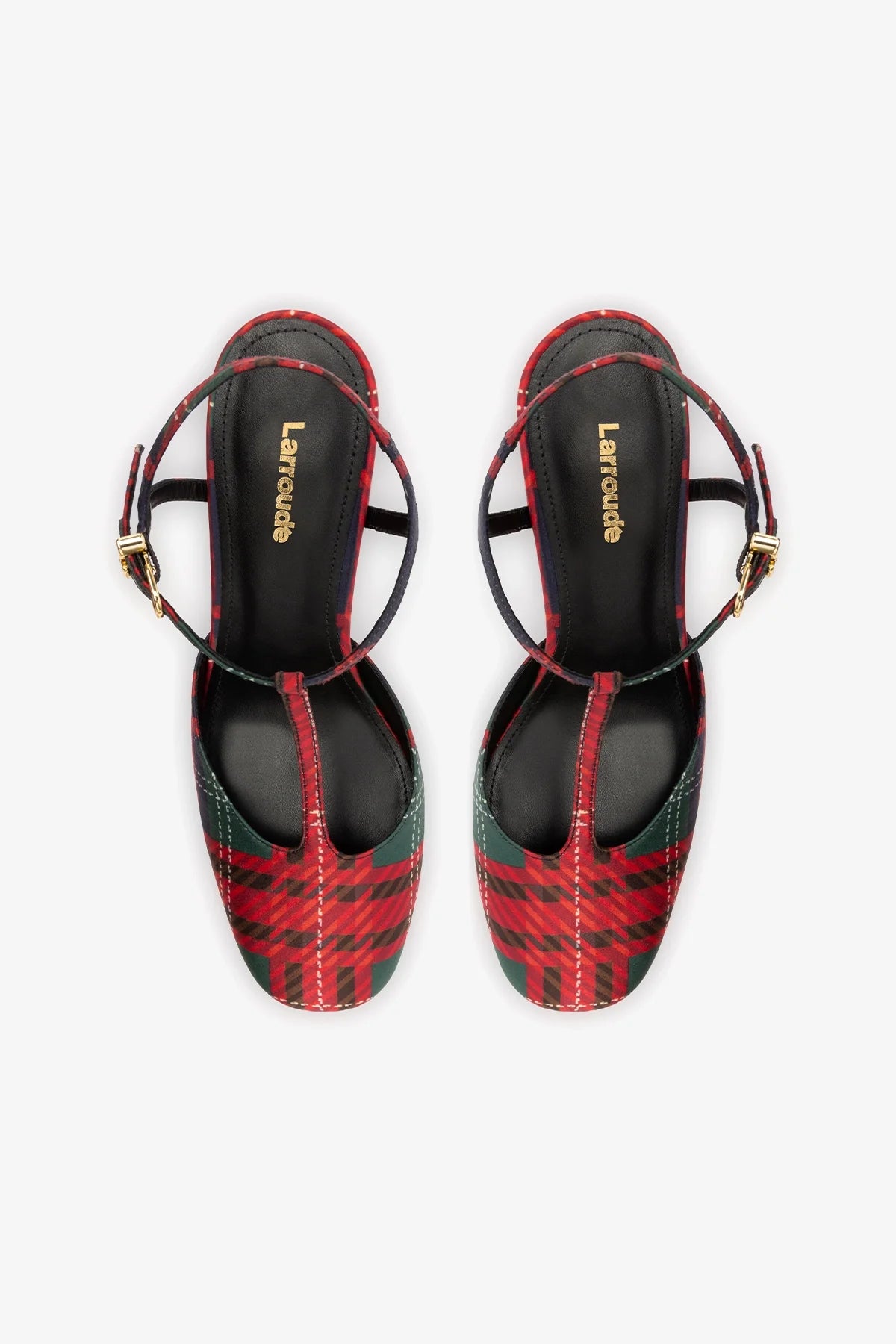 Pixie foi reimaginada em um vibrante cetim xadrez tartan. Seu salto altíssimo, porém estável por conta da plataforma, transforma esse modelo em uma adição ousada a qualquer look.
