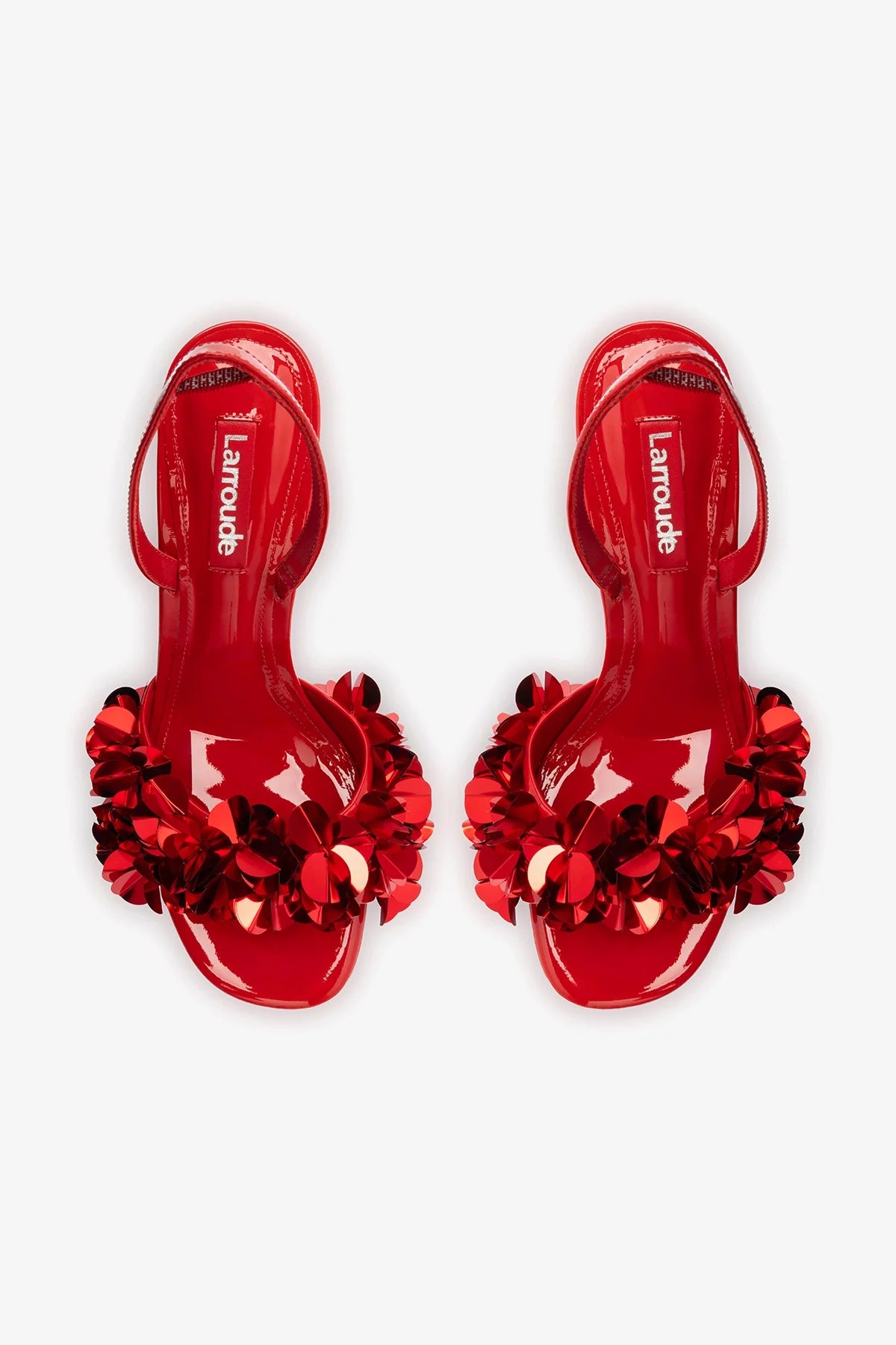 Morgan é pura festa com seu couro verniz e salto finíssimo. O cabedal em lantejoulas maxi bordadas à mão transformam essa sandália no toque perfeito para o seu look de festas.