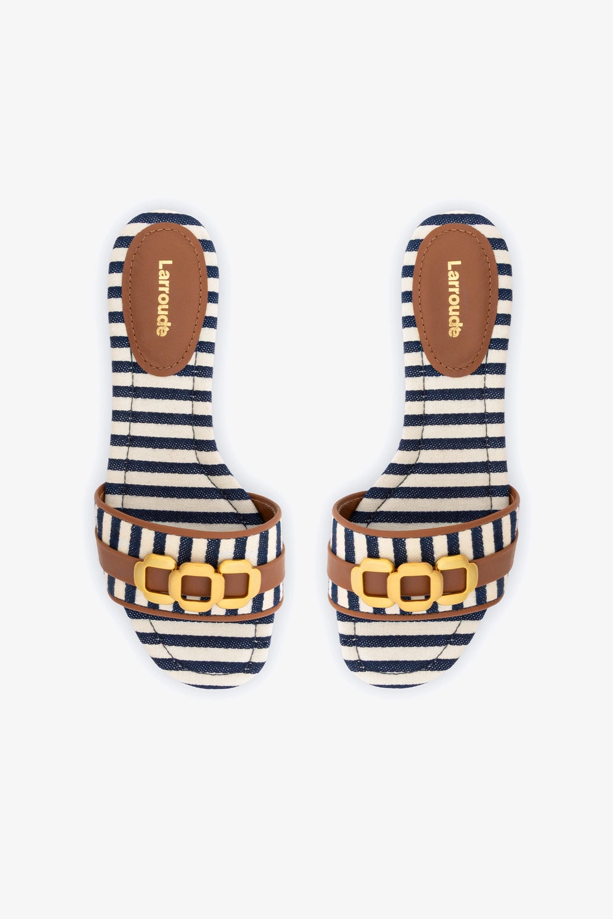 Flat Franca Lona Listrada Azul e Off White e Couro Caramelo